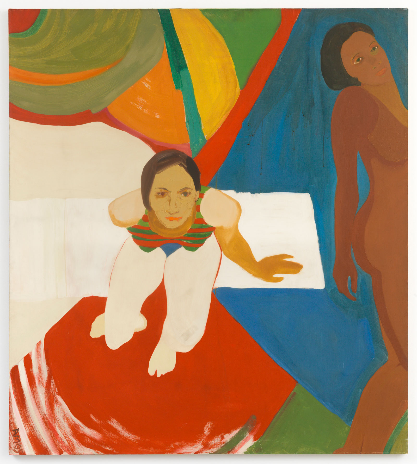 Amos’s name, if not her work, is most widely known because she was the sole, female member of the early group of African American artists, Spiral, which held its only group exhibition in 1965. For the “Black and White” exhibition she painted a 50 ¾-inch square, untitled work, abstract but for a recognizable hand at center. She sectioned off areas of the painting with vertical and horizontal lines so that it reads as a scene framed by a window, and in her work of the following year she continues the device of framing and complexity of indoors and outdoors spaces that Matisse had developed so effectively. The second gallery shows two further paintings which match the scale and palette of “Baby” and reveal the artist’s interest in portraying women of color as compelling subjects. “Seated Figure and Nude” (1966) shows a woman in a bathing-suit within a colorful but unidentifiable space; she is seen as if looking up at a viewer standing above her, while a darker woman exits the painting at right. Her pensive face might reflect that of the artist, asking whether this is a place where she belongs.