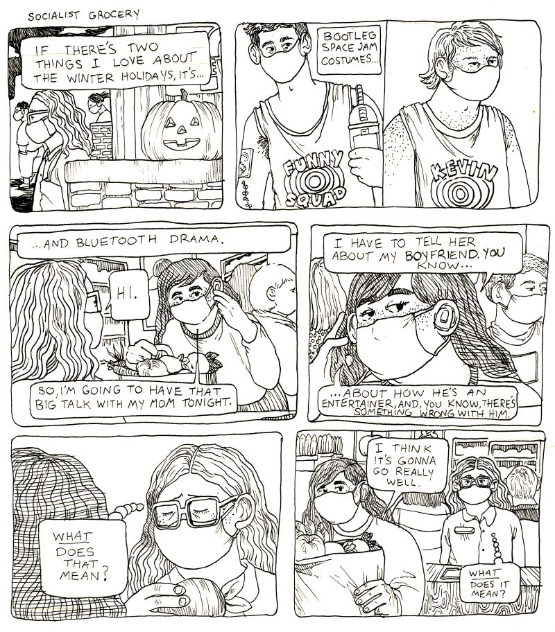 [Panel 3]: Sebastian’s head is turned in three quarters view as he speaks to a woman with long hair wearing a face mask, and holding a cart of produce. She is fussing with an ear bud in her right ear.