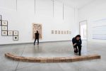 In the section on art inspired by maps and charts, Karmel discusses Kathleen Petyarre (Australia, c. 1938-2018) and her choice to paint with acrylics after the introduction of the medium by a teacher who worked in her Aboriginal community of Utopia; Petyarre had become allergic to the dyes she used for textiles, so switched to painting. Her motifs came from family legends and the local landscape and wildlife, and her language of dots originated in her community’s traditional body-painting used on ceremonial occasions. A spare woodcut by Zarina (India/U.S.A., 1937-2020) consists of a single line which meanders diagonally across an open plane. It’s form is the line drawn to separate India and Pakistan in 1947, which created massive exile and bloody consequences; armed conflict and exile were central topics for Zarina’s artwork. Mark Bradford (U.S.A., b. 1961) found the first materials for his collages in his mother’s beauty salon rolling papers, and later on the streets of his neighborhood in Los Angeles. His forms reflect city maps and their demographic markings, and his subjects include changing inner-city communities and their surveillance by government and police.