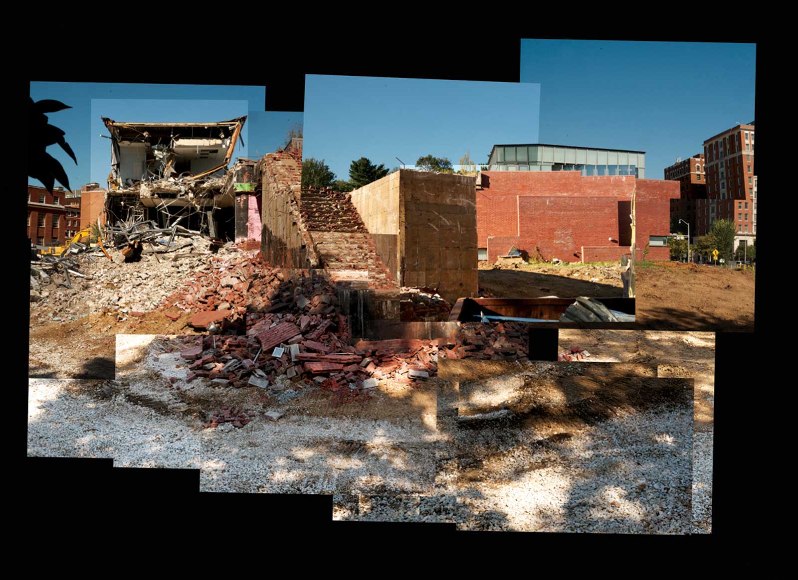 The demolition phase of the project took up the better part of the fall. There’s something almost poignant about a building being razed in autumn. It’s poetic, apropos the cultural and natural signifiers of death and decay momentarily merging in this ever-so fleeting moment, the falling leaves like so many bricks. And the dust! Ominous clouds of fine particulate matter blow out from the site, well beyond it, settling upon everything in their path like an almost imperceptible blanket of snow.