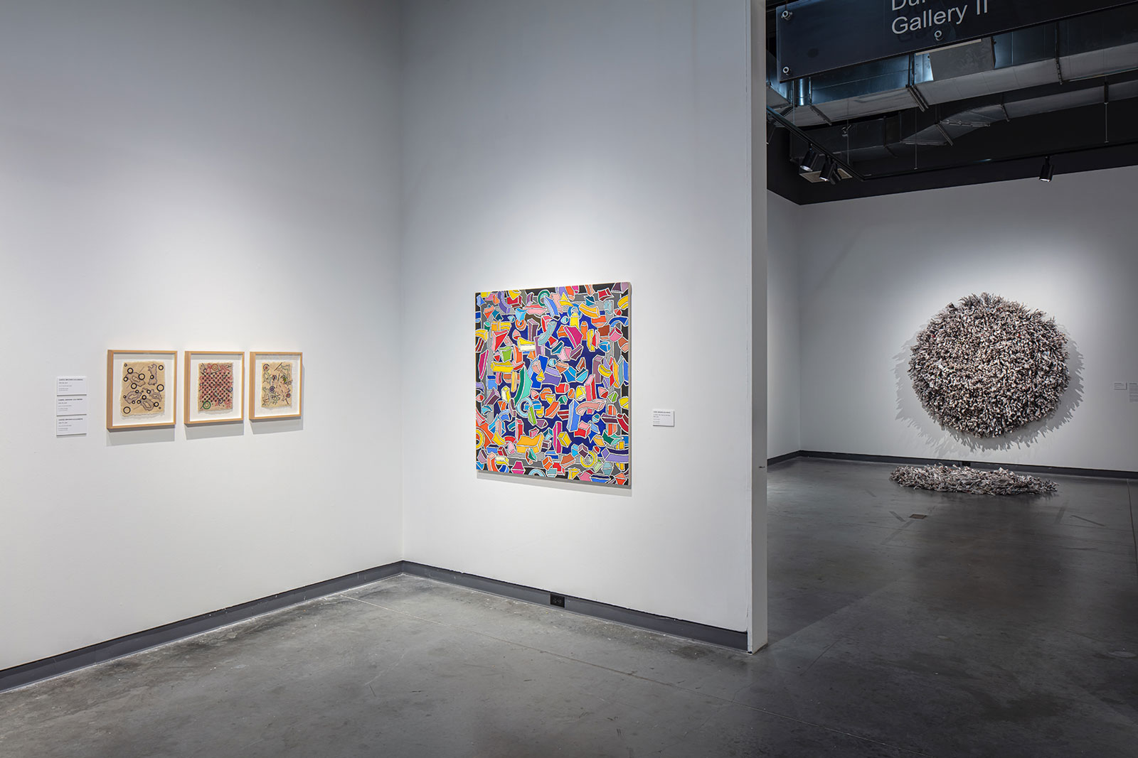 In addition to Ko, several other artists also employ everyday materials to produce abstract, complicated, and graceful works. Maren Hassinger contributes a two-part sculpture that she has installed in variation at other venues before too. “Wrenching News” demonstrates her background in both fiber arts and dance. The piece is two Mandalas, one on the wall and the other on the floor, created for the artist by staff and volunteers of the DC over the summer of 2021. Shredded, twisted, and wrapped newspaper strips from the New York Times bring the latest news of the real world, good and bad, into the gallery. Hassinger is one of the most well-known artists in the show, especially recognized for her performances and sculptures, with works in numerous museum collections.