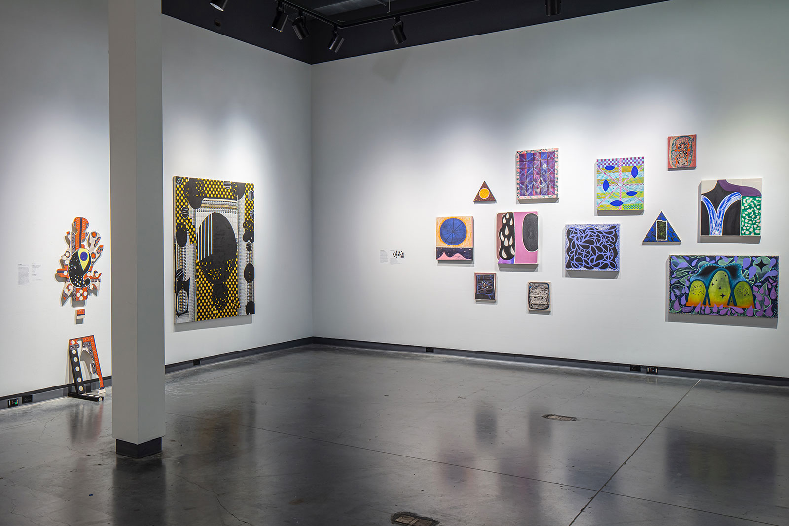 Carol Brown Goldberg, also an established artist, here presents paintings in both acrylic on canvas and ink on paper. She has an expansive repertoire of works that bring together symbols and expanding patterns. Natessa Amin employs acrylic on canvas to explore her hybrid identity spanning India, Kenya, and the Pennsylvania Dutch. Linling Lu’s brightly colored circular paintings begin as digital studies but finalize as acrylic paintings that she organizes into large wall installations of vibrating colors.