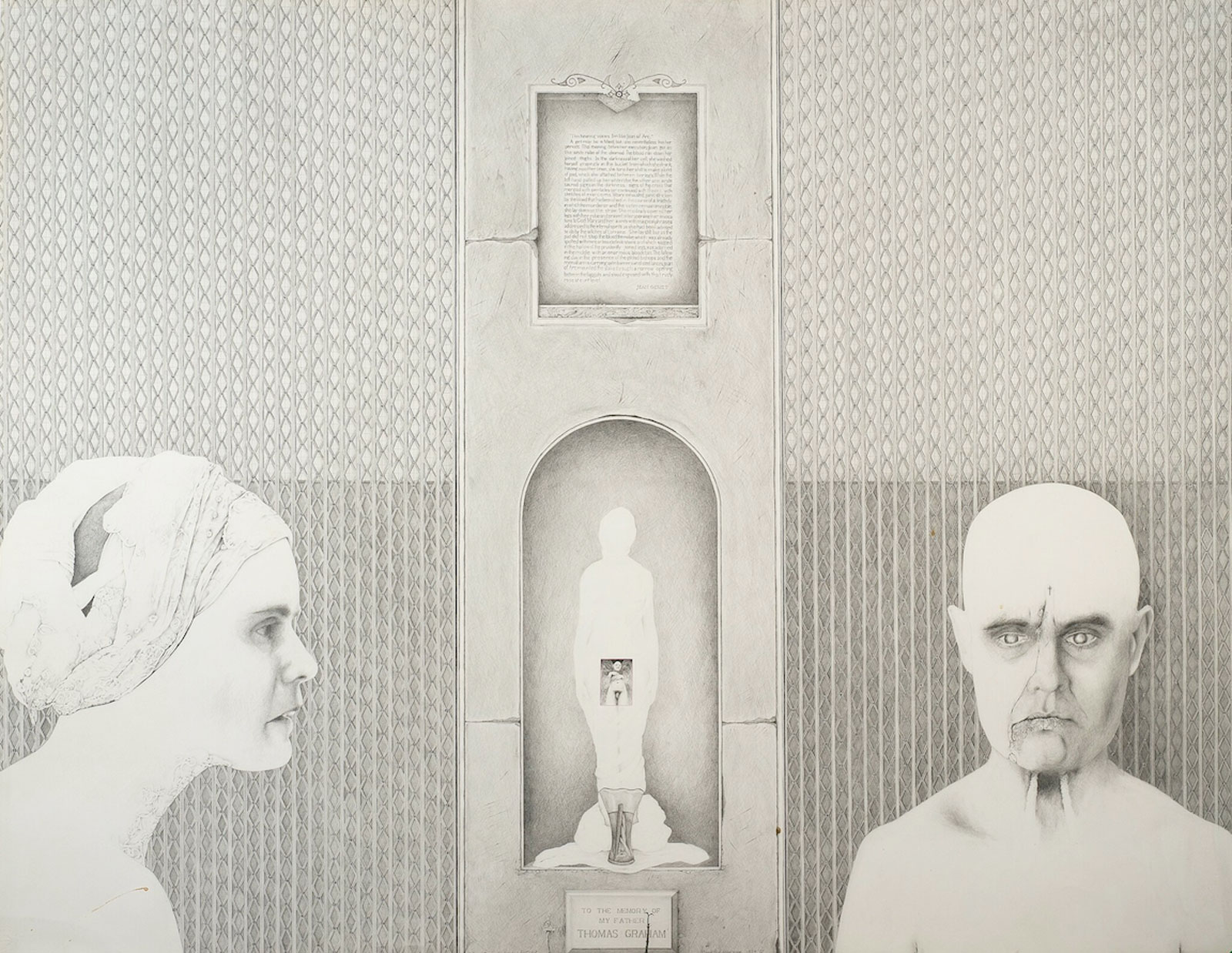 From the Gallery press materials: “The work of Anne Minich is bound up with the creation of a personal mythos that attaches a spiritual, otherworldly significance to a certain period of the artist’s life. Borrowing its composition from church architecture, Aqua Bride (mid-1970s) is a double self-portrait that delves into the eros and corpus of Catholic theology, identifying Minich herself with the passion of Joan of Arc.”