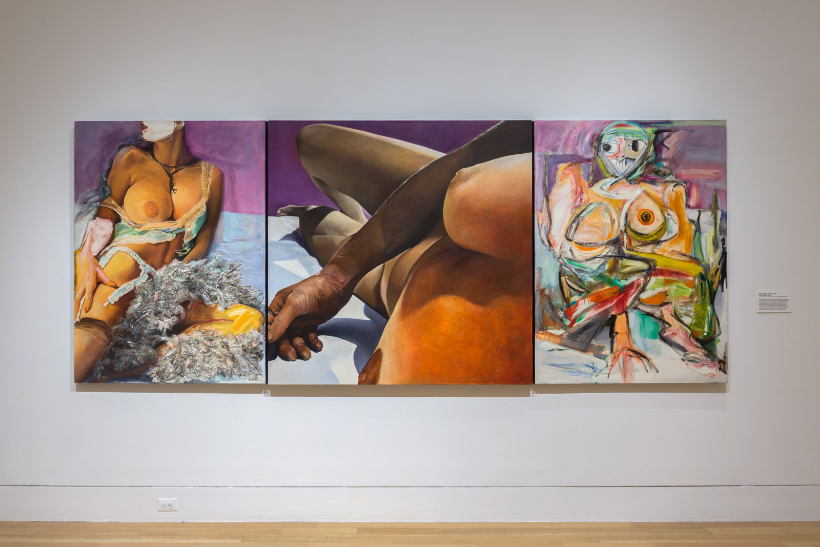 Her most didactic work is the funniest: the triptych “Mythologies and Me”(1976), in which she makes explicit the difference between a sensitive examination of a woman’s body and images more commonly created by men that range from pornographic to caricatural and hostile. In the center is a view of the artist’s breasts, right forearm and legs as seen when she is recumbent and observing herself. The angle is so extreme that it takes a moment to figure out what is actually shown. To the left is a conventionalized and faceless “Playboy” model with one revealed, frontal breast and a strategic arrangement of frilly garter belt and feather boa that calls attention to what it obscures. She is mirrored on the right by the equally target-like left breast of a woman as painted by de Kooning, anxious-looking and harpie-like, with a claw for a foot.