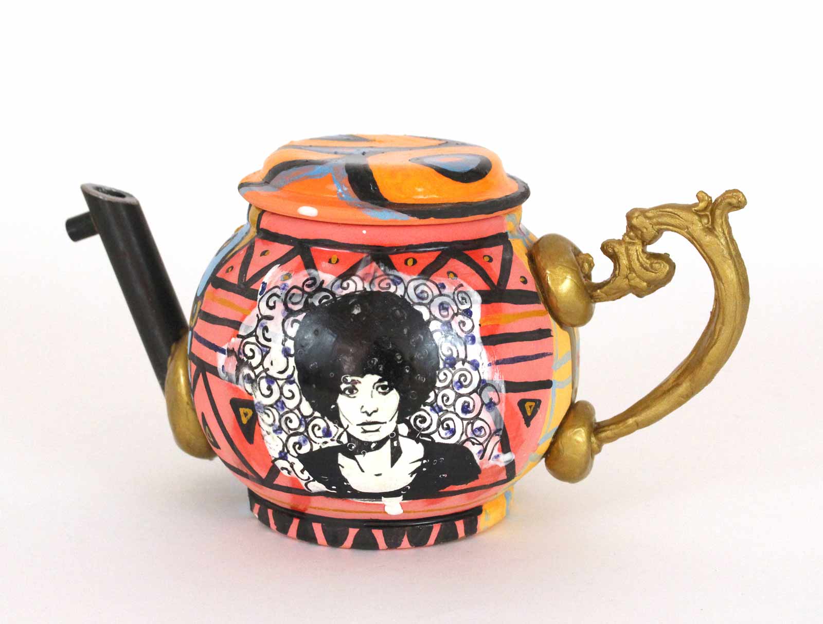 Black and white portrait of Angela Davis painted onto the center of a ceramic teapot with an ornate gold handle and a spout fashioned out of a gun barrel.