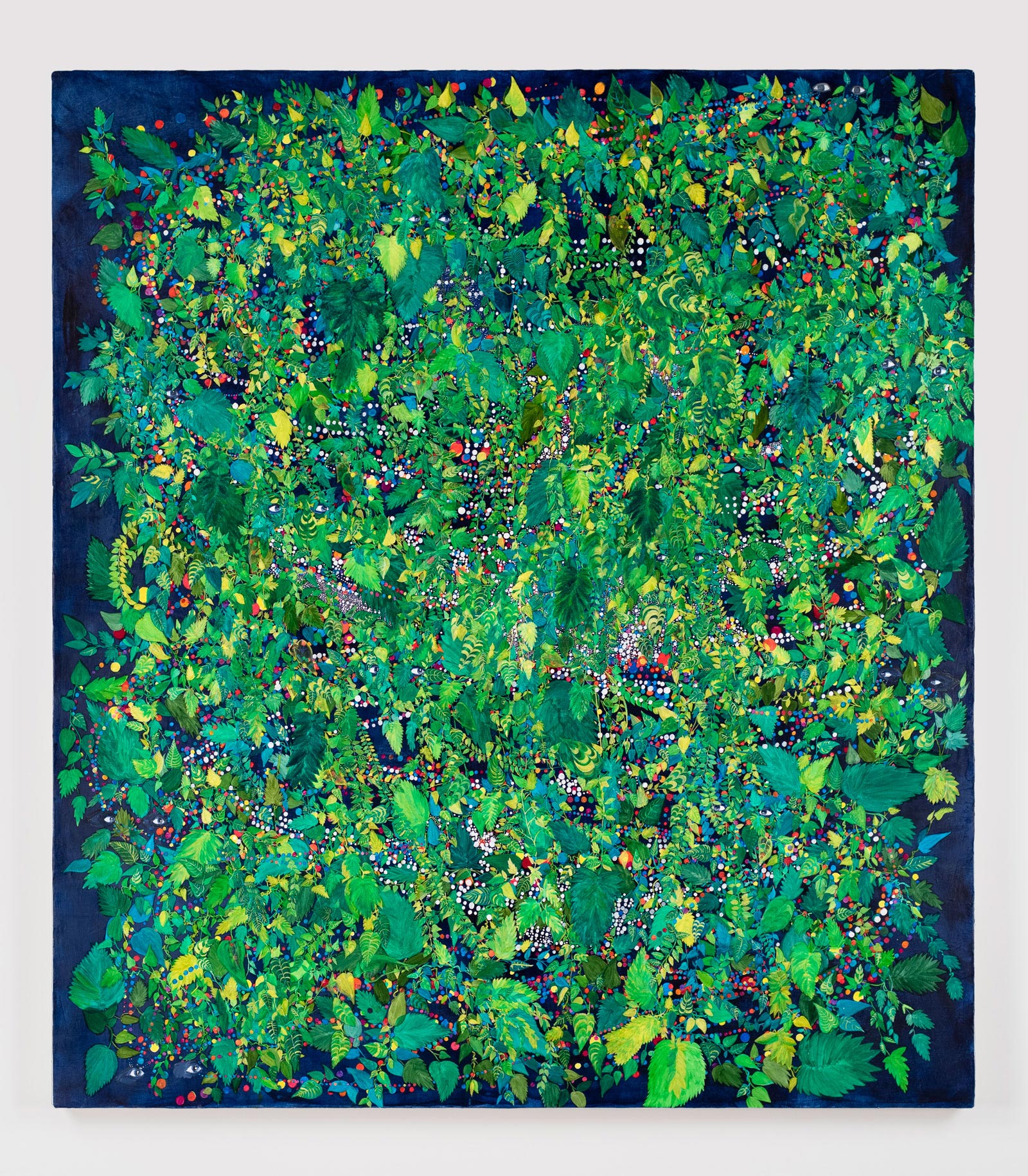 I am thinking about Sarah Gamble’s show Theory of Everything from my kitchen window, which overlooks an unruly bamboo thicket. Her paintings of dense vegetation have the same shimmering cadence as the light breaking through the wall of deep green plants, turning yellow and white at the edges and almost blue-black in the shadows. I half expect to see something or someone peering back at me, as the floating eyes do amongst colorful dots and trellised plants in Gamble’s “Acacia” (2021).
