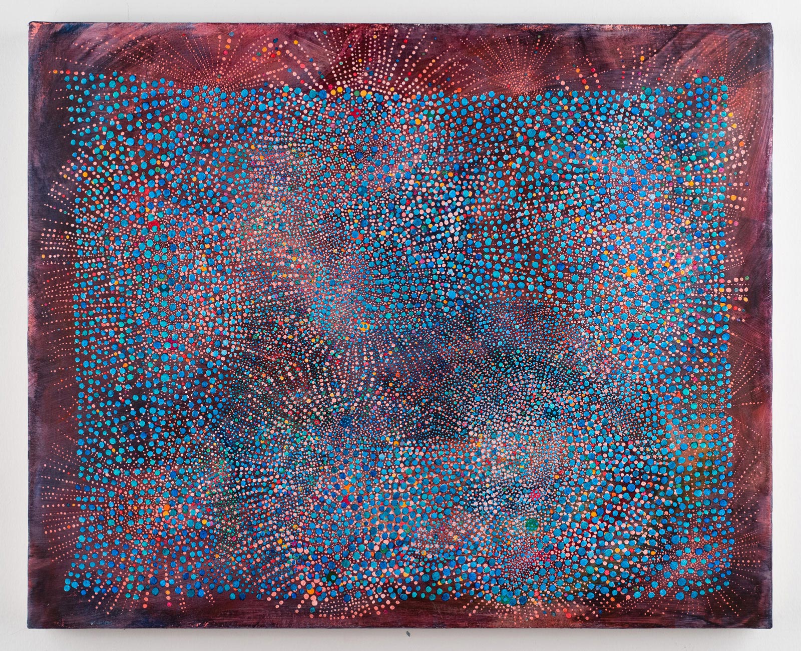 Gamble’s mark-making echoes natural structures just enough to feel as if it was not made entirely by human hand. It feels post-human, not in a doom and gloom apocalyptic way, but as an ecology wherein language is shared across beings. Some of my favorite paintings in the show are the small abstract works, like “Hologram “ (2019): a rectangle of mostly blue dots float above starbursts with flecks of red, and yellow atop a pink-brown brushed ground. The visual texture is that of a sea urchin, or aster flower, minute points shifting gently as the eye focuses.