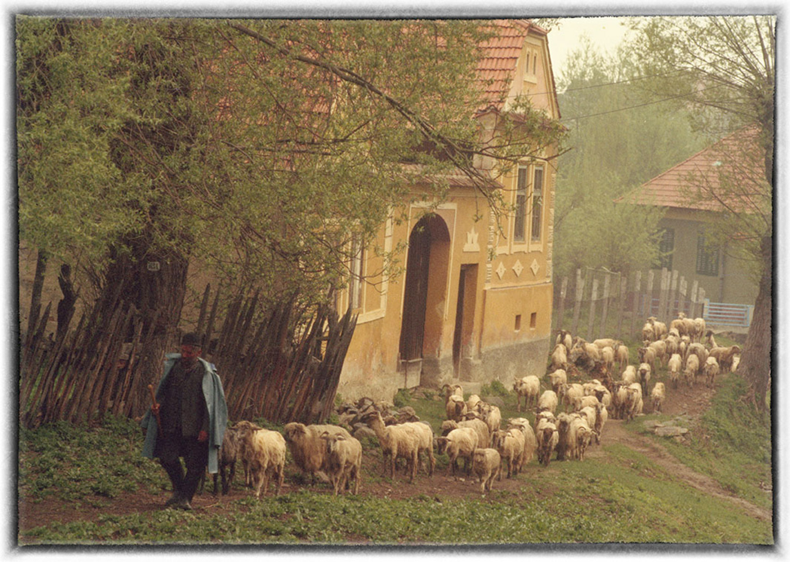 Photography, by its very nature, would seem to individualize the creature; but context is everything. Seen as a herd, there’s little difference between one sheep and another, and in his photographs of the pastoral life, Salzmann portrays the herd qua herd, a collective, an unwieldy unit that needs to be managed by shepherd and dog. The pastoral life may be the oldest of stories, but it has generally been portrayed in static terms, despite the fact that shepherds are always on the move as they drive their herds from one region to another. In Salzmann’s photographs, we see real sheep and real shepherds, in motion as they move across landscapes and over roads; and we see the working relationship between shepherd, dog, and sheep portrayed with equal respect for man and beast. Salzmann spent a year living with the transhumant shepherds of Romania, depicting the symbiotic bond of their survival and their movement together from the mountain highlands in the summer, and back down to the valleys in winter. With his anthropological background, Salzmann characteristically sees the animal as an integral part of human society, not only in pastoral Romania but in other folk cultures he has photographed throughout his career, from Eastern Europe and Turkey to South America.