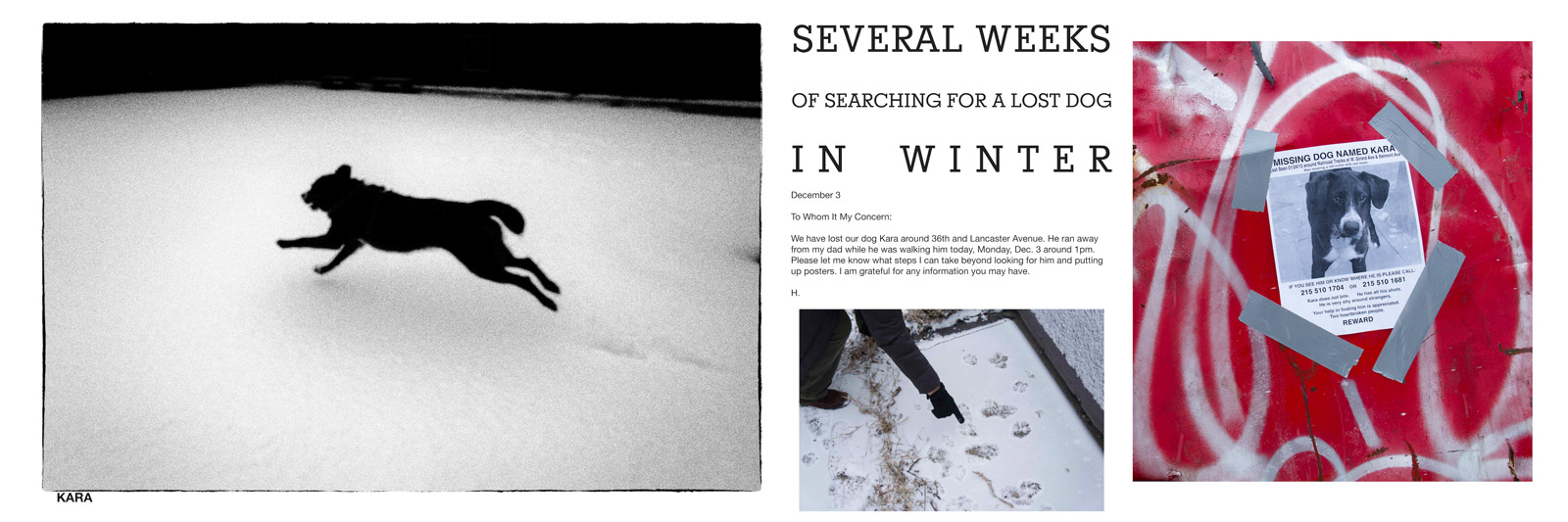 The other dog story, Several Weeks of Searching for a Lost Dog in Winter, is based on a narrative written by the photographer’s daughter, Han Salzmann, with photographs by Salzmann. The generic title–searching for a “lost dog”–ironically belies the intensity of the tale and the individuality of the sheepdog, Kara, who escapes from Salzmann while they are on a walk. The narrative is a collage of messages and reports detailing the anguish and anxiety of the months-long search, marked by numerous false leads, while the photographs record the persistence of Salzmann and his wife (typically at 6 AM on cold winter mornings) in combing nearby West Philadelphia neighborhoods, vacant lots, rail yards, anywhere the dog might have been briefly spotted. The Salzmanns are looking for a lost child, but in this case, the child is capable of surviving for two years on her own, until she is by chance befriended by a stranger whose kindness eventually restores her to the Salzmanns.