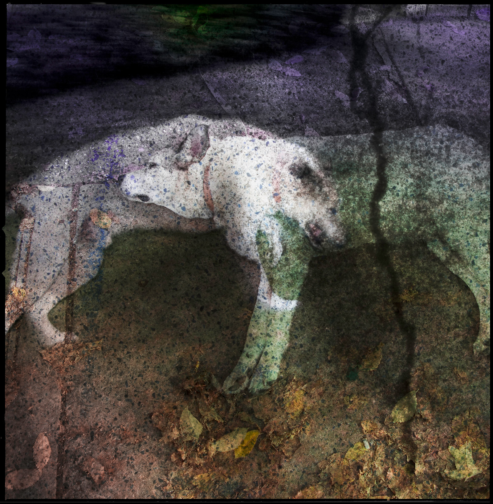 A sheepdog who is not employed is another story altogether, and Salzmann features two such dog stories in his show, each the narrative of an individual dog. Salzmann is not the first to individualize his canine subject–think of Jack London’s great dog tales–but where London creates an interior subjectivity in his fictitious animals, pushing them into heroic careers as surrogates for our own dear selves, Salzmann allows the dog to be their own dog selves, imbuing his images with respect for their otherness at the same time that he focuses on the bond between dog and human. In one of his picture stories, Garip (1995-2008) Returns to the Life He Left Behind, Salzmann eulogizes a sheepdog brought to America by the photographer’s wife, Ayse, from an archeological site in Gordion, Turkey. Garip’s new life as a Philadelphian in the Salzmann family was a happy one, from the photographer’s perspective, but Salzmann’s keen awareness of Garip’s deracination is the creative source of the photographic series that imagines him, as in a dream, returning to his country of origin and to his lost life as guardian of sheep. In dramatically overlapping, palimpsestic images, Salzmann, working with collaborator James Rowland, transforms his photographs into a mournful, phantasmagoric montage, a moving memorial to the photographer’s respect for the dog’s otherness.