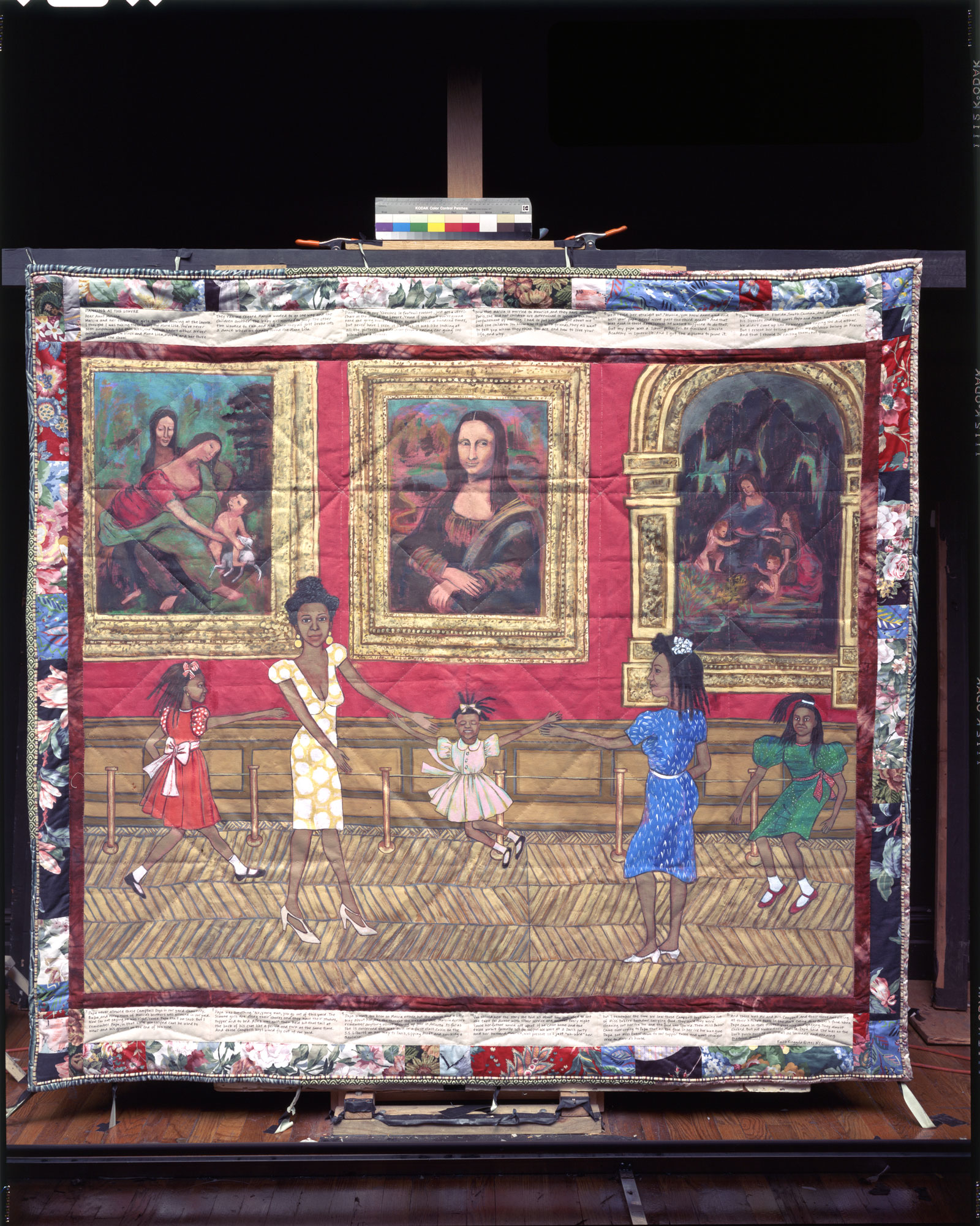 On the fourth floor, my copy of Dan Cameron’s book “Dancing at the Louvre” became an off-the-shelf reality. Gallery lights focus on each elaborate quilt of a series that innovatively takes on European painting. Ringgold continues highlighting overlooked Black geniuses while placing her alter-ego Willia Marie Simone among them in Paris. In these works, Josephine Baker has a fabulous birthday party, Manet’s Olympia has brown skin, Gertrude Stein sits with James Baldwin, and Willia enjoys Van Gogh’s sunflowers and Picasso’s cubism.