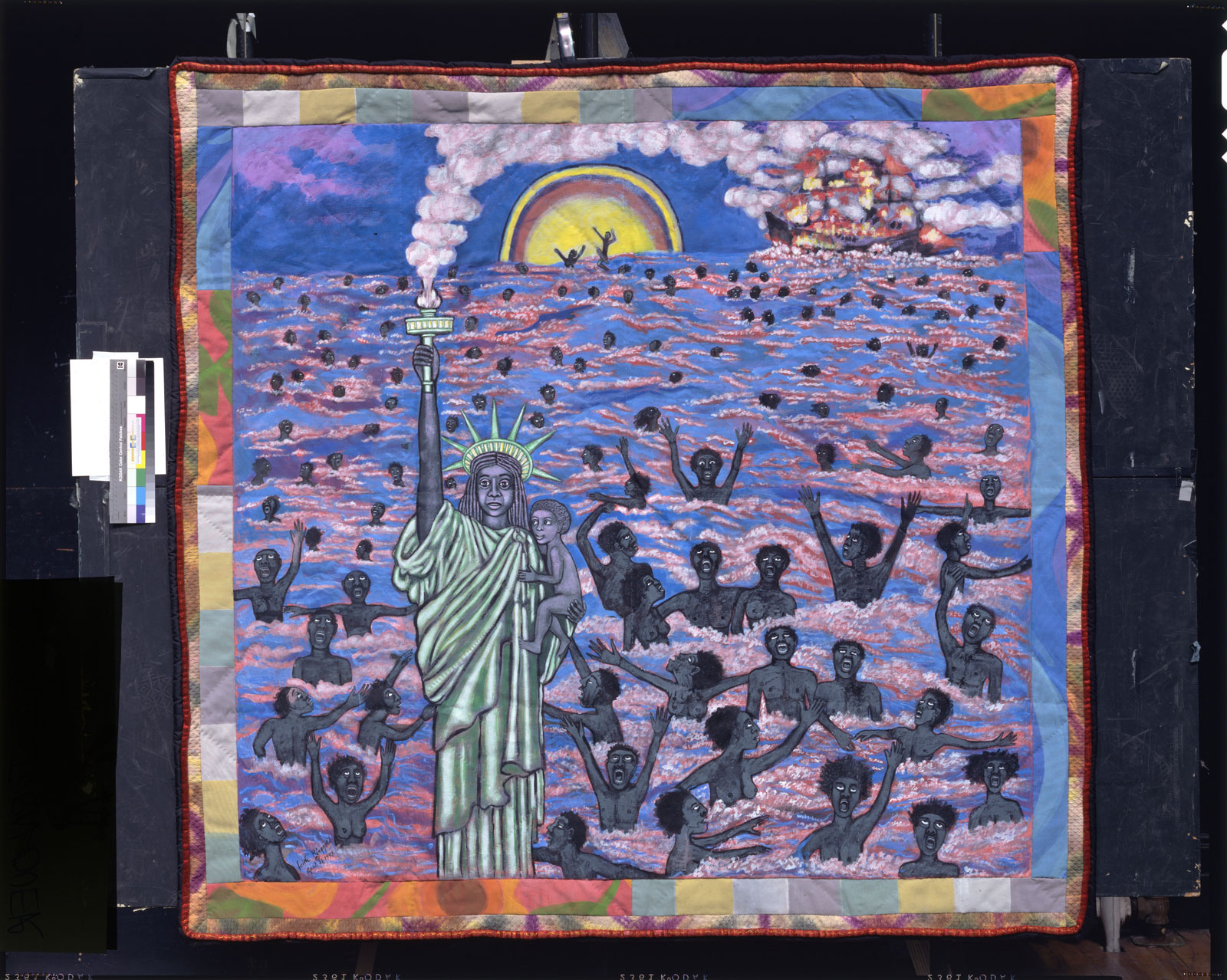 The third floor celebrates pioneers— Harriet Tubman, Malcolm X, Martin Luther King Jr, and Sojourner Truth; contains delightful illustrations from her award-winning “Tar Beach” children’s book and includes raw, heavier material. “We Came to America: The American Collection #1,” with a Black Statue of Liberty holding a baby in one arm and raising her flaming, smoking torch in the other, as Black bodies flee from a burning ship.
