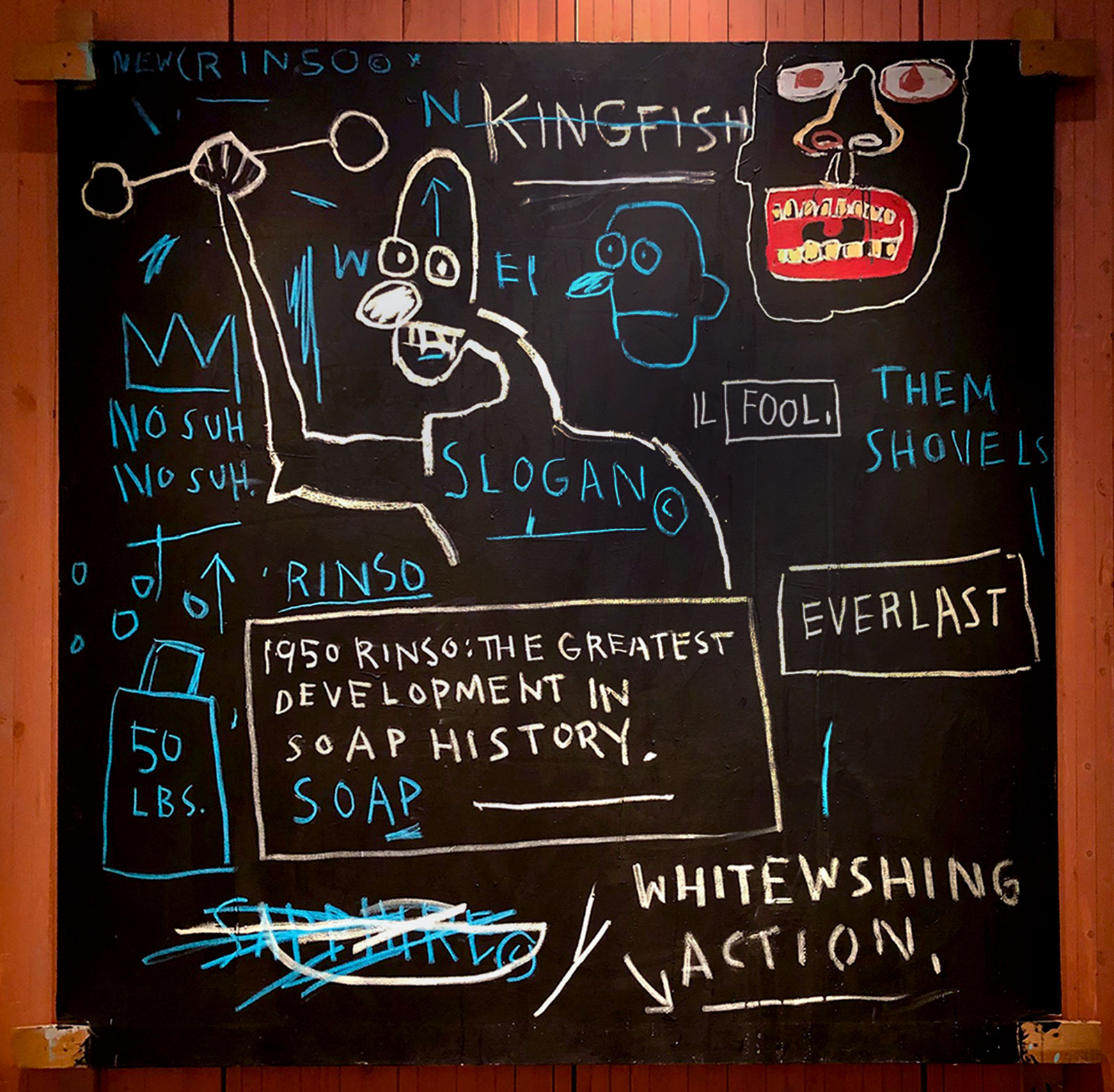 Basquiat does not censor his intentions. He is an artist keenly aware of his worth and uses that advantageous knowledge to advocate for himself and others. The anger-filled “Untitled (Rinso),” an acrylic and oil stick painting, on a stark black background, criticizes the industrial complex and capitalism by using the first mass marketed laundry soap in America—Rinso— “the greatest development in soap history.” Capitalized words take up most of this composition with the slave lingo “no suh” repeated under his trademark crown. A figure lifts up a weight and on the other side spells “Everlast”— a popular brand of boxing gloves. The words “sapphire” and “kingfish” are crossed out.