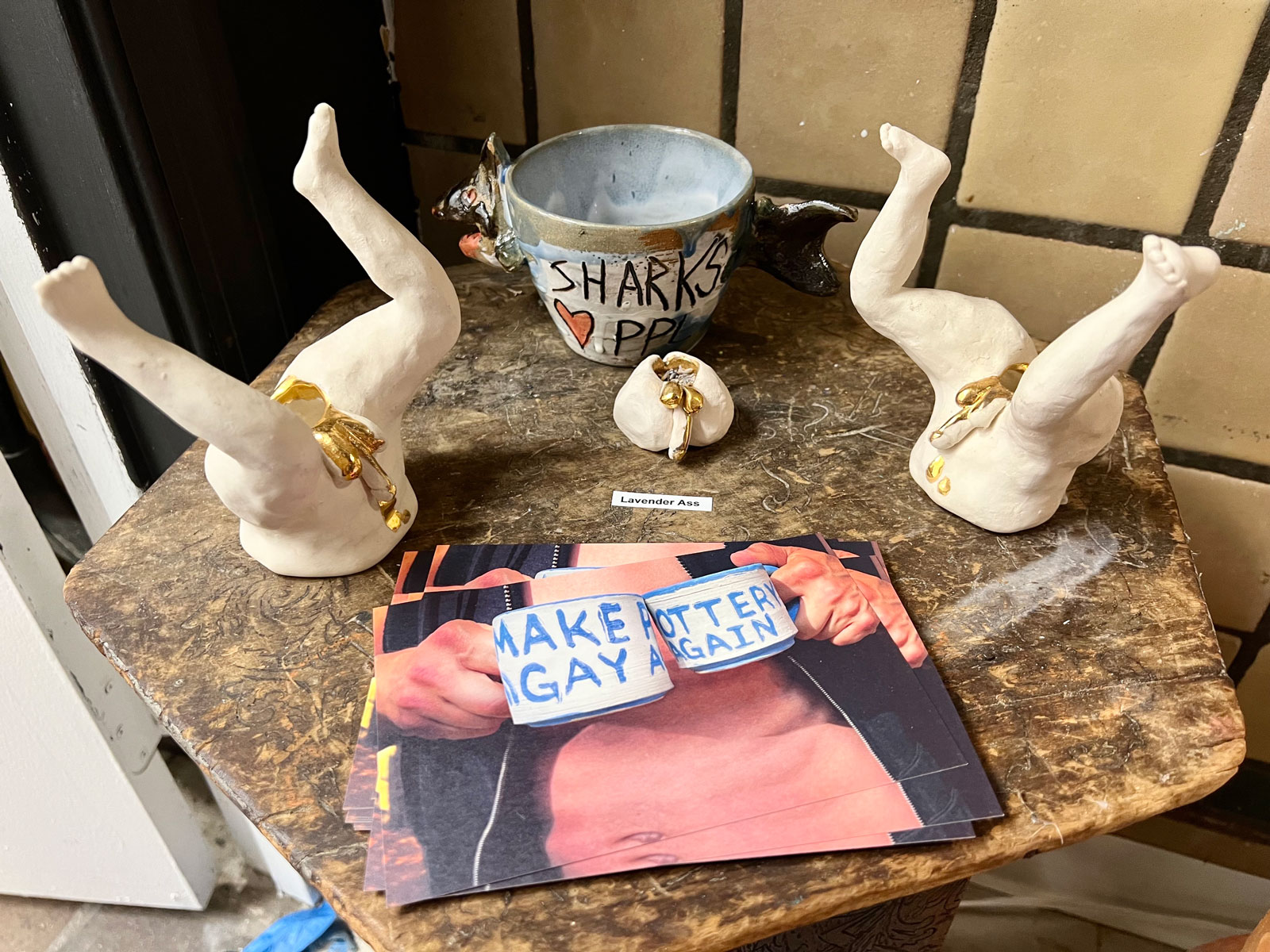 The final exhibition space, the ReD RooM—also a functioning bathroom—is filled with pottery made by Peterson, the ceramicist who helped Omar-Abba cast the porcelain crowbars. His show is called Make Pottery Gay Again and includes a row of glazed mugs with phrases like “420,” “gay 666,” and “drugz” painted on. In the corner is a stack of dishware below a sign that reads, “Miscellaneous Plates and Bowls (without satanic gay stuff).”