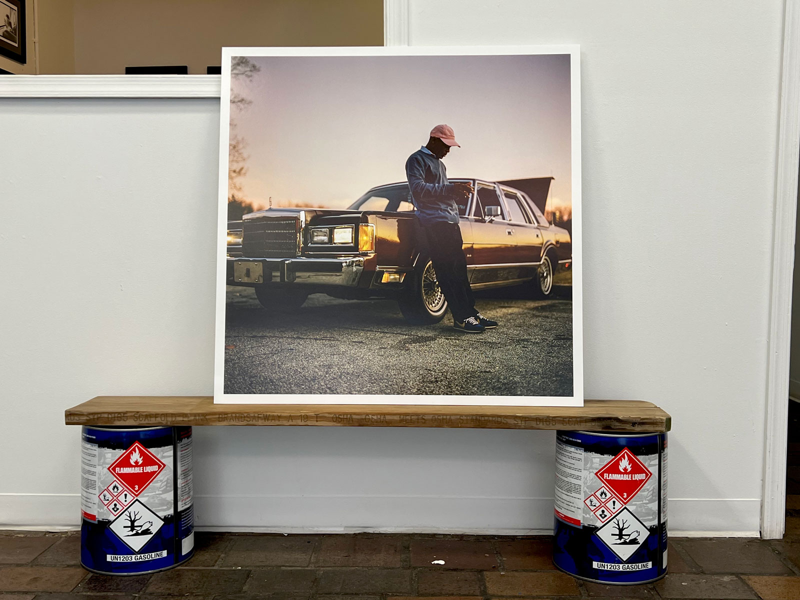 Rather than making the space feel messy or chaotic, Omar-Abba’s DIY presentation—which, it’s clear, was still carefully considered—makes his work feel approachable. You could stick your nose right up to the prints and inspect the film grain without worrying about being barked at by a security guard. If you really wanted to, you could get on your hands and knees and sniff the inky black motor oil that, as part of the central sculptural shrine, has been decanted into a wide ceramic vessel. The gallery doesn’t just look like a car garage; it smells like one, too.