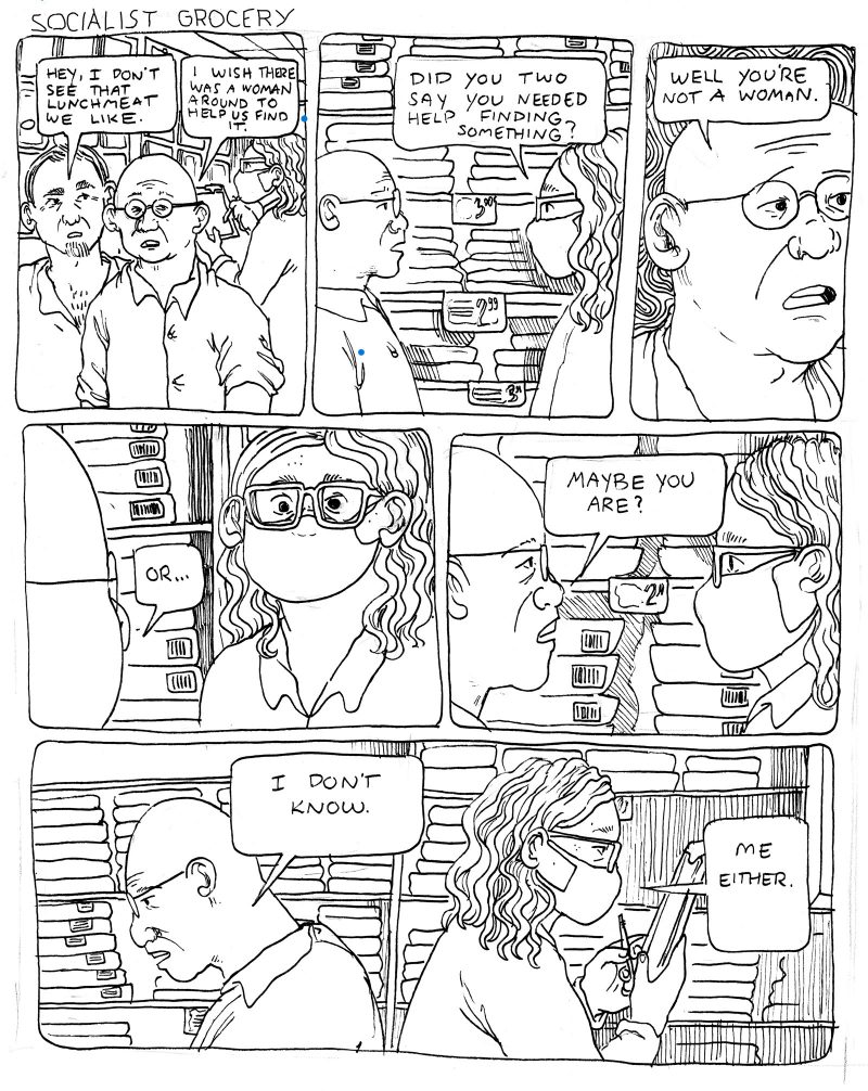 [Panel 1]: Two men– one with a goatee and short hair, the other bald with round glasses– walk down an aisle in the grocery store where Sebastian works; Sebastian stands in the background counting inventory.