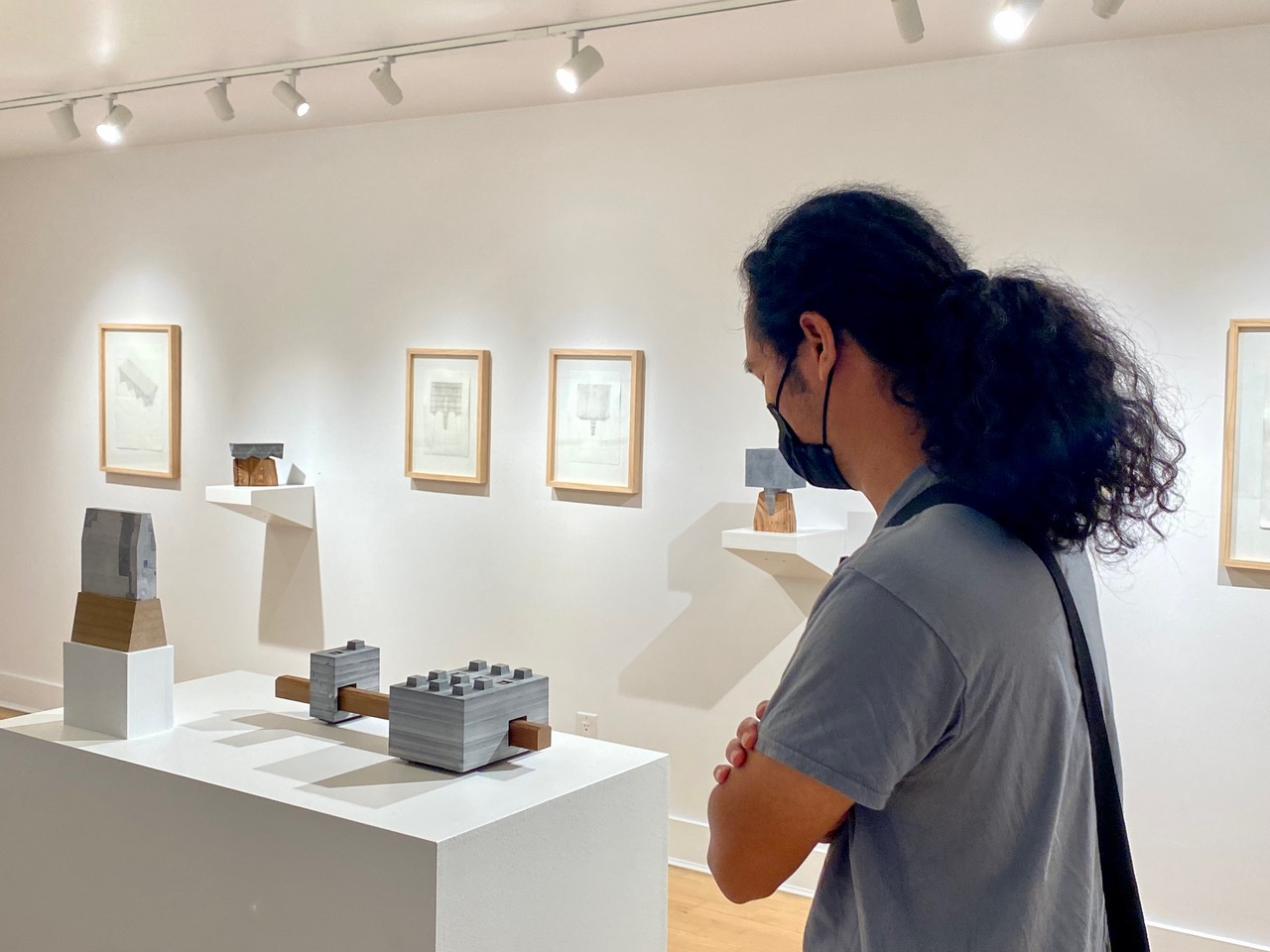 A visitor at Gross McCleaf Gallery observes a sculpture installation.