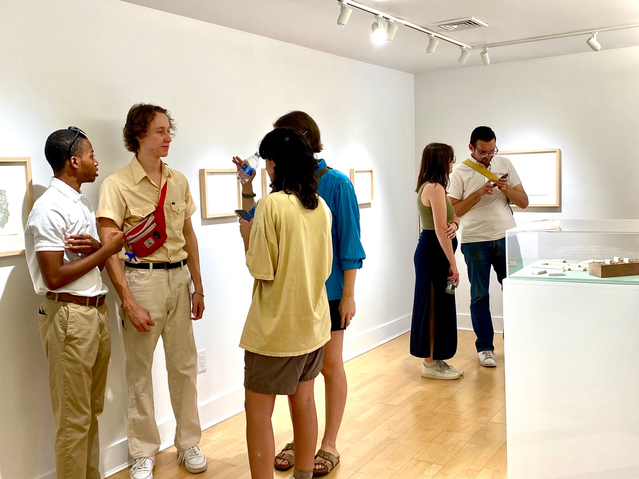 At Gross McCleaf Gallery, visitors make conversation in the exhibition surrounded by art.