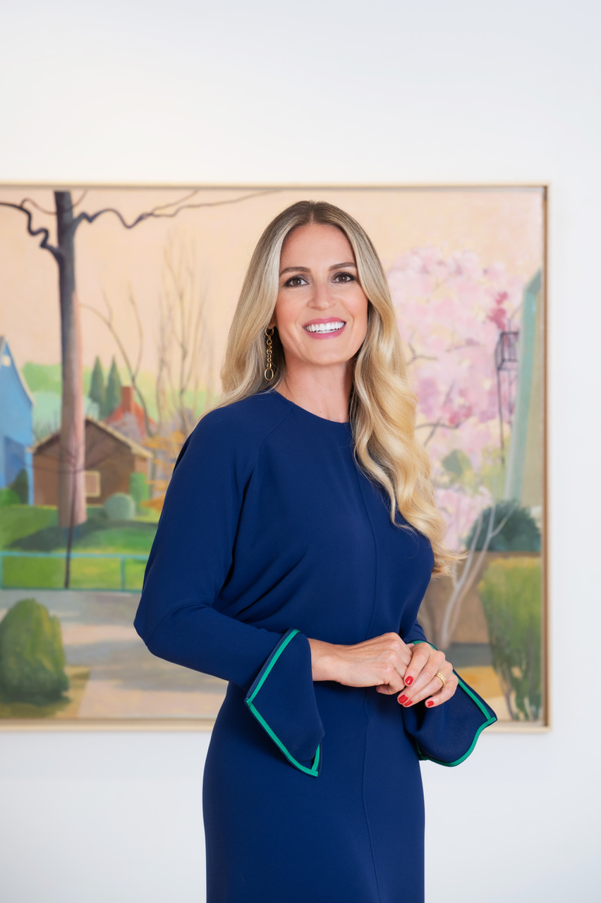 A photo of Rebecca Segall, owner and Director of Gross McCleaf Gallery since November 2020. Segall is smiling and stands in front of a landscape painting.