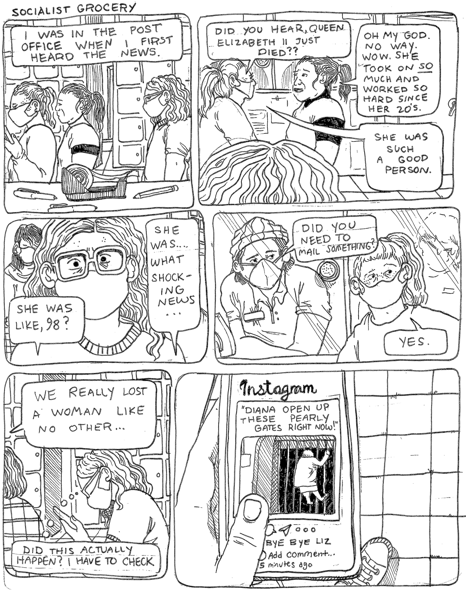 A large 6-panel black and white comic from the series “Socialist Grocery,” in which Sebastian recalls the moment they learned of Queen Elizabeth’s death at the Post Office.