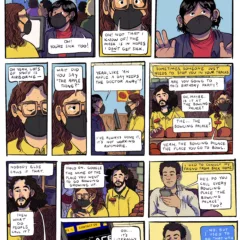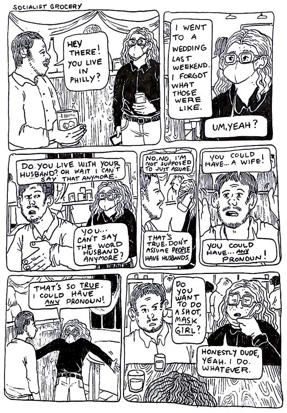 In the bottom right panel, the two of them have walked up to the bar they’ve been standing in front of. The misguided stranger asks, “Do you want to do a shot, mask girl?” So close, but so far from understanding the point! Worn out, Sebastian pulls down their mask and says “Honestly dude, yeah. I do. Whatever.”