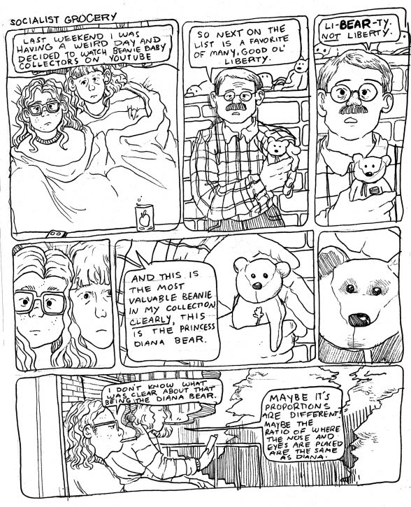 In a large 7-panel comic from the Socialist Grocery Series by Oli Knowles, Sebastian dives into the strange world of Beanie Baby collectors.
