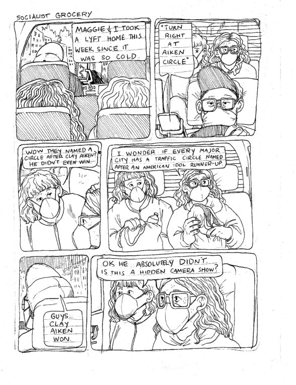 In a 6 panel comic from the Socialist Grocery Series by Oli Knowles, Sebastian and Maggie talk about Clay Aiken with a Lyft Driver.