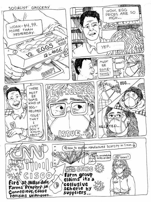 A 7 panel comic from the Socialist Grocery series by Oli Knowles where Sebastian has an awkward conversation with a customer about eggs and conspiracy theories.