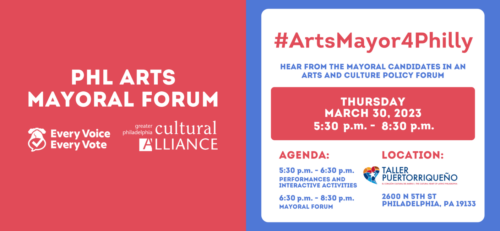 Taller Puertorriqueño hosts a second Mayoral forum, organized by the Greater Philadelphia Cultural Alliance and the “Every Voice Every Vote” project. Join us on Thursday, March 30, 2023 for the PHL Arts Mayoral Forum (6:30 p.m. – 8:30 p.m.) as Philadelphia’s mayoral candidates discuss the issues facing the city’s arts and culture sector. We are excited to host 300 in-person attendees and 1,000 virtual attendees for this live-streamed event.