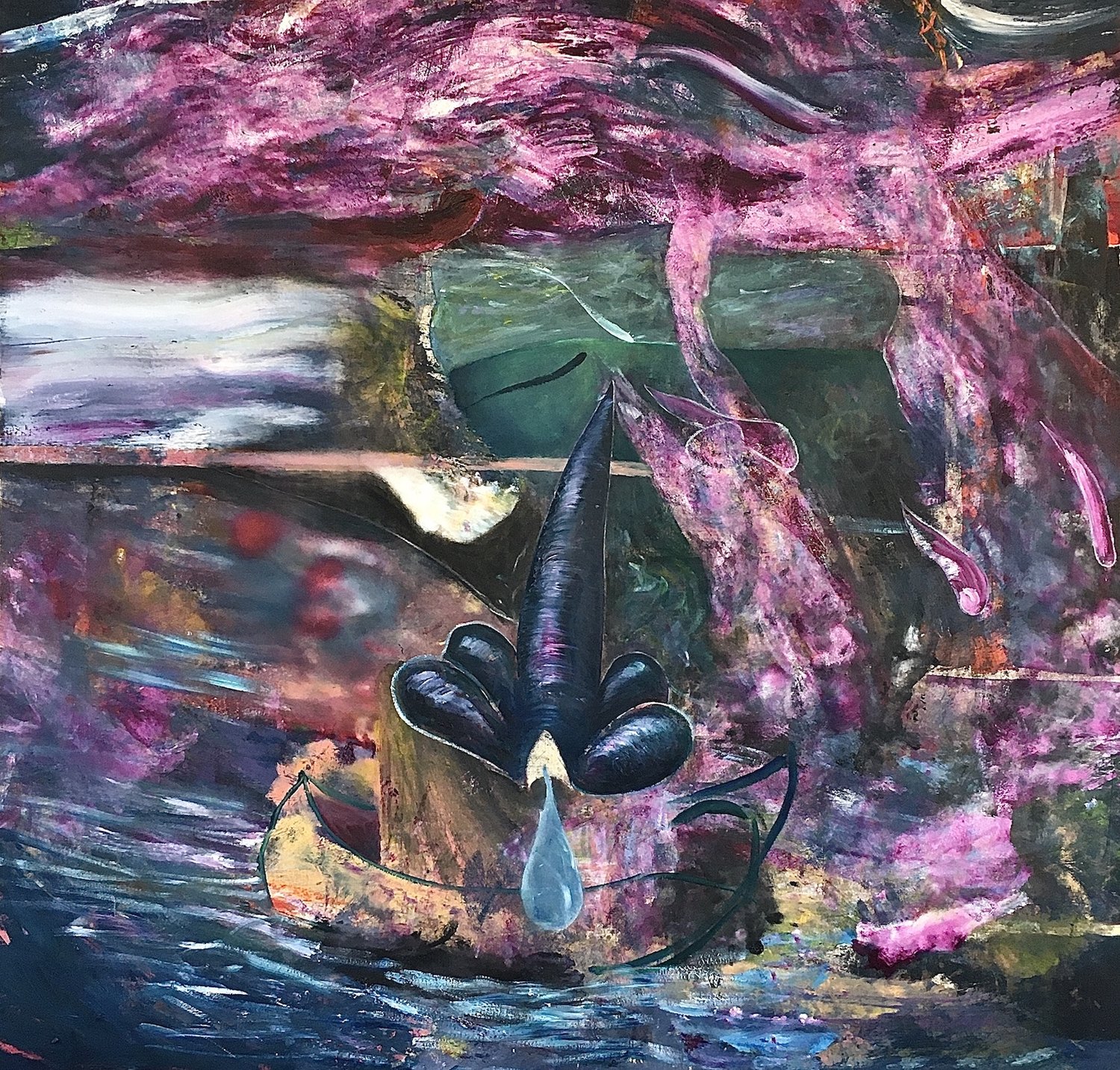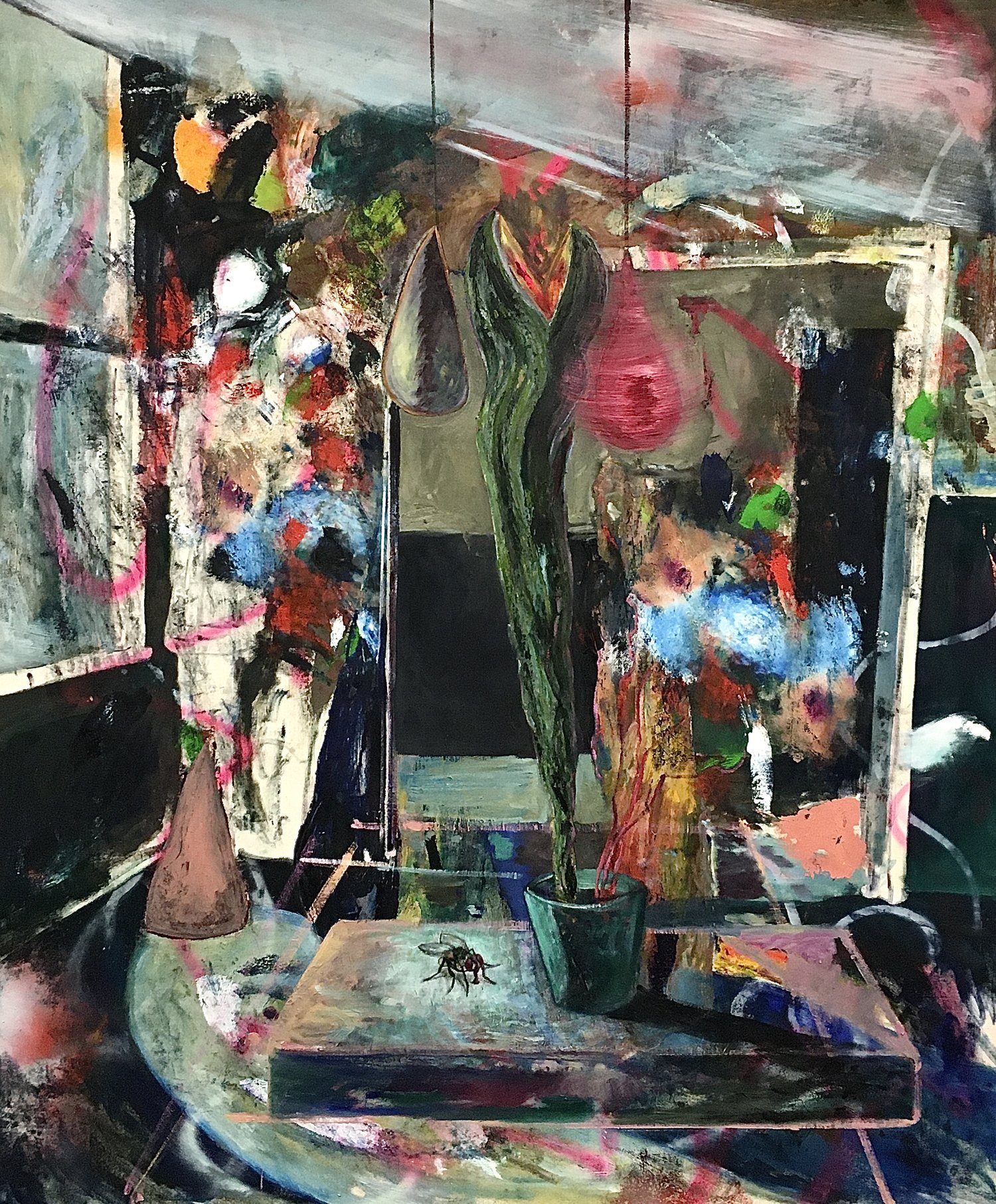 Where these macho guys could become boggy to revisit, Bell animates his art historical focus with a sense of humor and the inclusion of the at-hand: a fly (the star of the show), a ring pop, a billowing dress, a house plant. All of these are rendered with a wild, saturated palette that explores mark-making with abandon. As compressed as some areas of the paintings become, Bell keeps his colors crisp (rich black, violets, sapphire).