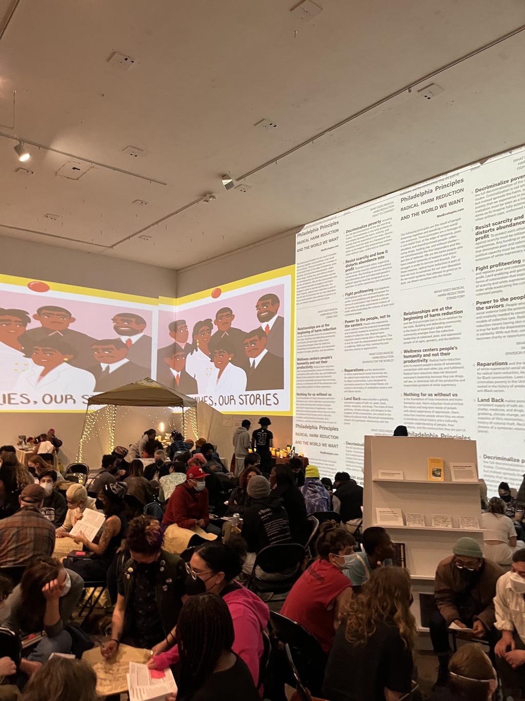 After Raani Begum, a full-service sex worker, activist, and writer, posed that question for the closing workshop, the audience broke into their own pods of eight to ten people as instructed and discussed what harm reduction meant to them. Begum’s workshop was the last one of the day, following a community care and herbalism workshop and a land revolution workshop. Begum cued the attendees with a full wall projection featuring tips on what harm reduction might look like, from the basic idea that “wellness centers people’s humanity and not their productivity” to providing a basis for understanding what “reparations” means for disenfranchised native Philadelphians.