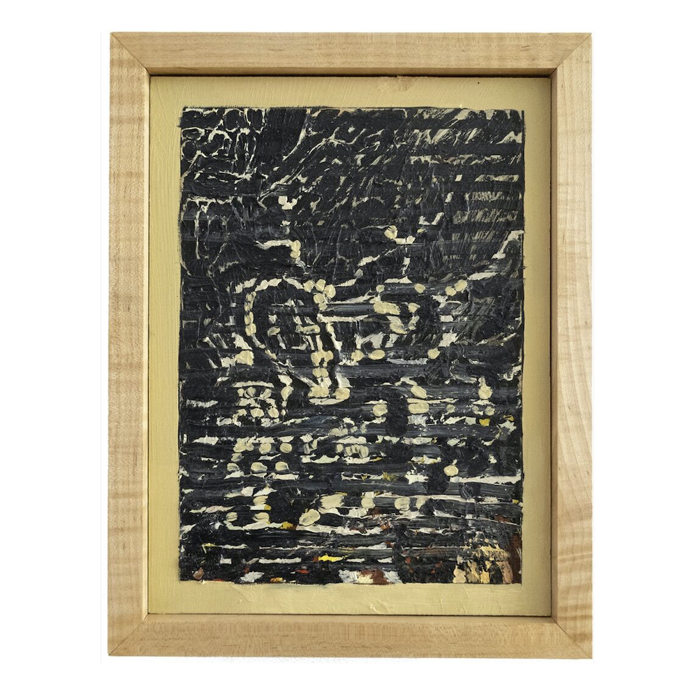 The joke is, at the end of both the Donner Party and the Oregon Trail game – nearly everybody dies. The phrase “going west” can also mean to die. The small paintings seem to trace the journey west, the going dark. Brushwork snail trails over wooden hewn surfaces – like paths on paths. As one moves along the wall of paintings from left to right – things flicker in and out of the candlelight of recognition and into the encroaching night. The night at first illuminates colors previously unrecognized and then, slowly obscures more and more information. Night Vision references the spotty abstraction that comes with eyes adjusting to the dark – the painting has striations that mimic the flickering lines of an old computer screen. The title of the last painting in the sequence is Cut Off which is presumably a reference to the Donner Party being cut off from the mountain trail by impenetrable snow which, in turn, making hungry cannibals out of them.