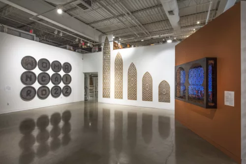 The Mashrabiya Project featuring works by (L to R) Nadia Kaabi-Linke, Majida Khattari, and Nadia Kaabi-Linke. Image courtesy of The Museum for Art in Wood.