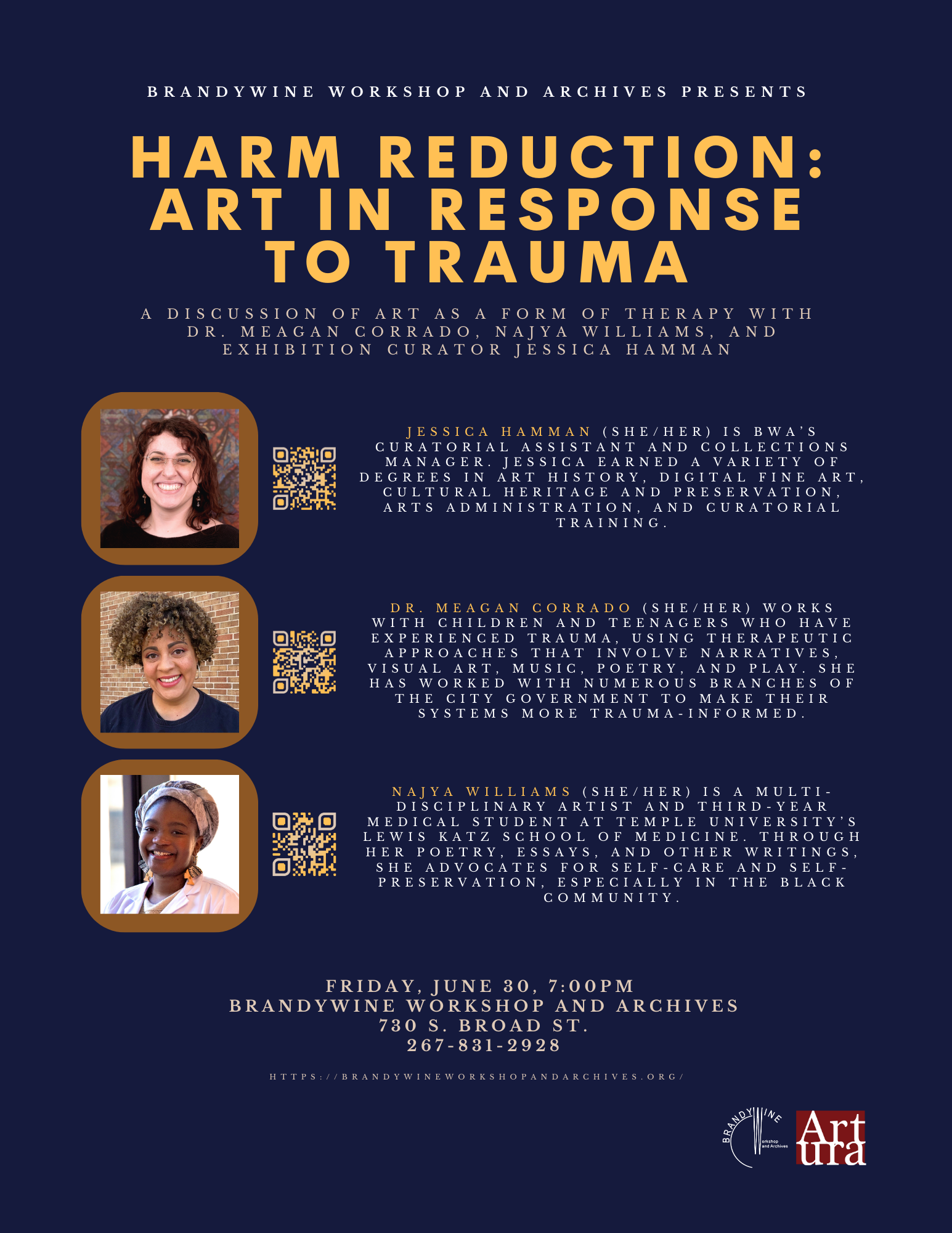 On Friday, June 30, at 7:00 PM, BWA will present a discussion of Harm Reduction and art as a form of therapy with Jessica Hamman, BWA’s Curatorial Assistant and Collections Manager, Dr. Meagan Corrado, and Najya Williams.