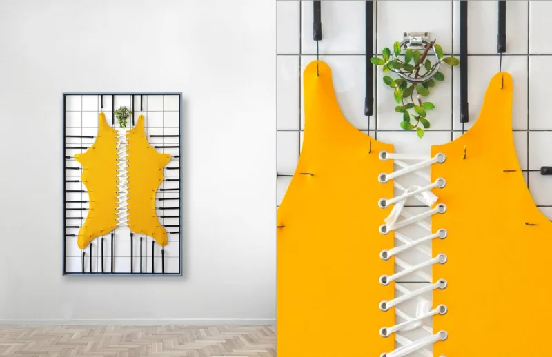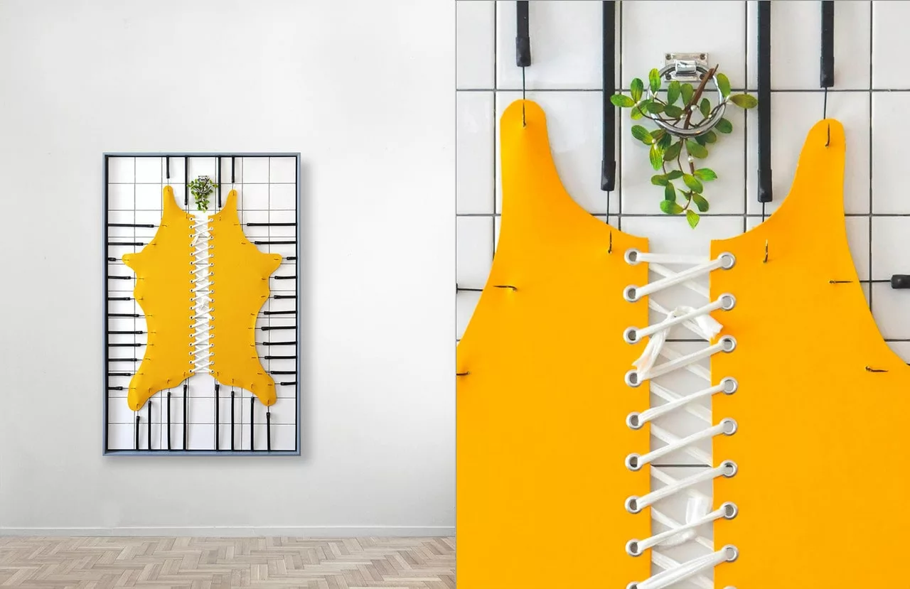 Redemption by Dave Tavacol, Cowhide, hooks, rubber, tile, ring pull, mistletoe, other media 45 x 70 x 4″ 2022 Image courtesy of Vox Populi