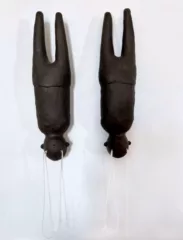 In the entrance to the gallery, Williamson has displayed work photographing many mothers in South Africa which flanks three large central pieces by Kganye. Kganye’s most recent and ongoing work “Mosebetsi wa Dirithi ” is dedicated to large gorgeous hand-stitched portraits made from tiny gray, white, and black pieces of fabric. These figures are her grandmother, mother, and cousin whom she only knew through stories. The tones mimic the black-and-white photography that Kganye uses almost exclusively in previous works. Now the figures have taken on a larger-than-life, textural quality. Their small collaged pieces create a subtle visual animation on the surface of the image – mimicking the videos also on display.