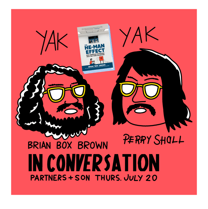 Partners and Son is thrilled to host a release party for Brian “Box” Brown’s newest book The He-Man Effect. Box will be signing books and talking with Perry Shall. The conversation will be recorded for an episode of the podcast Vintage Annals Archive.