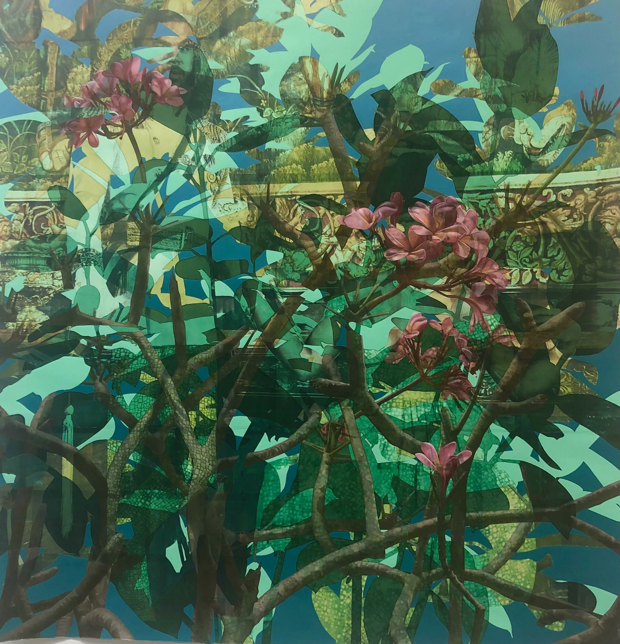 For example, “Dwellers: Native One” and “Dwellers: Cosmopolitan Ones”– made three years apart– figures hide beneath wild labyrinths of repeated geometry. The fence structure remains a constant vehicle. Both pictures operate a surrealist approach, playing with gestural shapes as the main focal point. Patterns compete for overlaying dominance in and out of realist brushstrokes and adhered images. The sophisticated intertwining encourages the viewer to wander between, to search for faces and take pleasure in their found joyful expressions. While both works employ a candid interest in tightly rendering plant form, the muted color palette in “Native One” tests green and yellow hues and “Cosmopolitan Ones” contains vivid experimentation, surprising pieces of luscious pink flowers breaking up the aquamarine and teal.