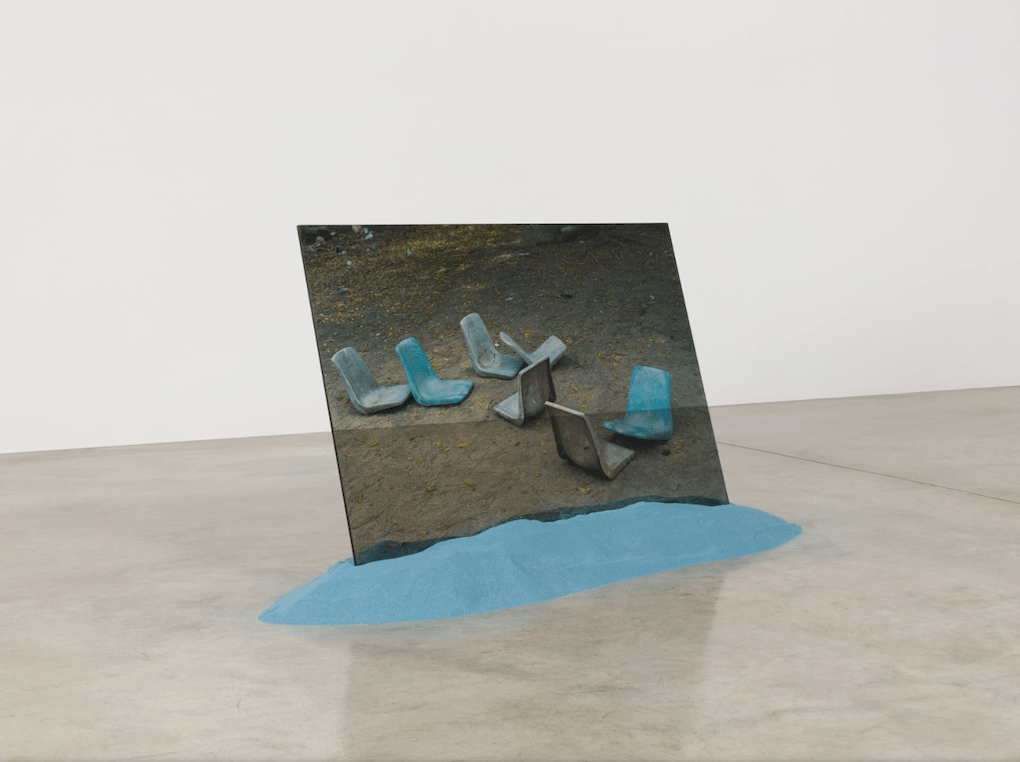 Karyn Olivier, (DIS)(RE)(IN)PLACE, 2023, transparent photo on Plexiglas, tinted sand, steel, 24 x 52 x 12 inches Courtesy of Tanya Bonakdar Gallery, New York, via List Gallery, Swarthmore