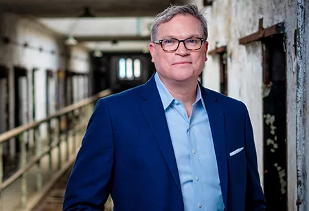 Sean Kelley, Senior Vice President and Director of Interpretation, stands inside the historic site, Eastern State Penitentiary, which he served for 28 years. Mr. Kelley will embark on a new professional chapter following his years of dedicated service to ESPHS. Photo courtesy of Eastern State Penitentiary