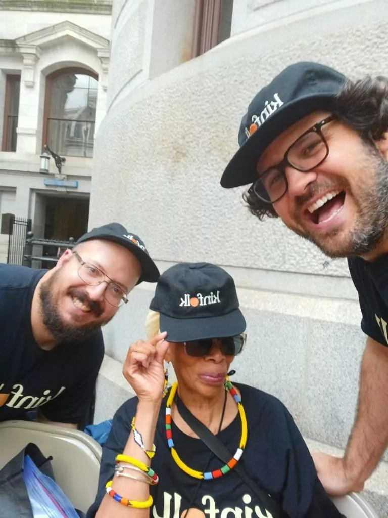 Artist Betty Leacraft (seated) with Kinfolk team members Micah Milner (right) and David Dominguez (left) at the City Hall debut of the Kinship augmented reality monument project in which Betty’s monument, made with the tech assistance of Milner and Dominguez, honors musician McCoy Tyler.