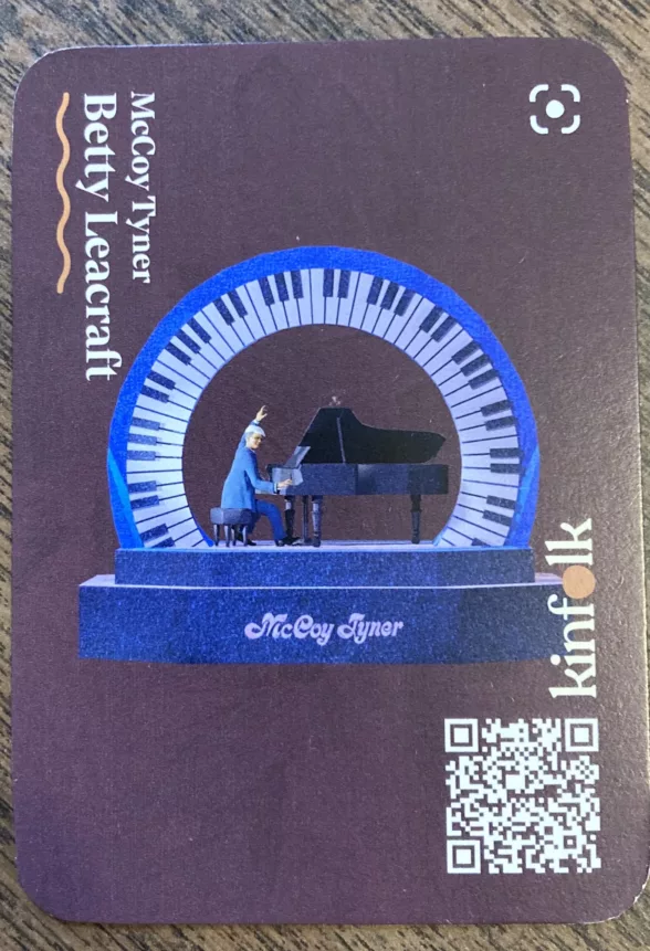 A card with lettering and a central image and a QR code show Betty Leacraft’s Augmented Reality monument to musician McCoy Tyner, made with Kinfolk. (Ed Note: You can open this app through the QR code and see the monument and “place” it in your landscape. Try it!)