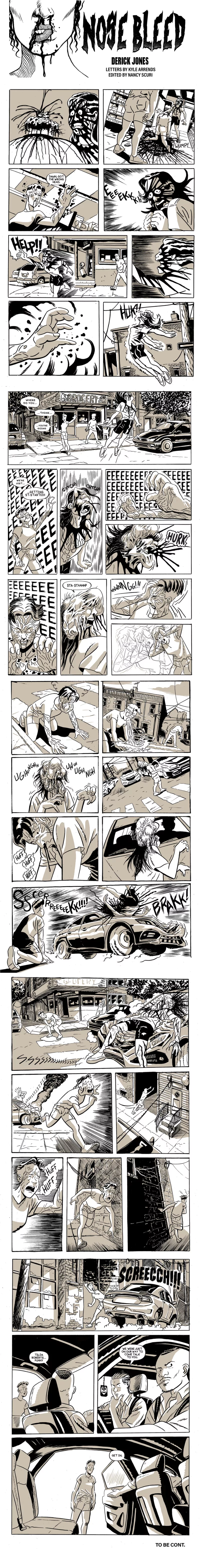 34 panel comic entitled “Nosebleed Chapter 9” by Derick Jones. Letters by Kyle Arrends, Edited by Nancy Scuri.