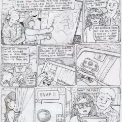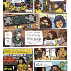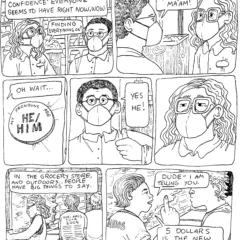In this 7-panel comic part of the series Socialist Grocery by Oli Knowles, Sebastian begins with an observation, “It’s not necessarily horrible, but lately, a lot of people think I’m a straight girl.” Panel 1, Sebastian is being propositioned by a bearded bespeckled straight white man, “So, you don’t want to go out for coffee with me on Saturday?” Sebastian responds, “I have a date with my spouse that day.” The other person responds, “Well, miss, your husband is a very lucky man“. (Underlines are the author’s) Panel 2, a co-worker is talking to Sebastian, “Hey, just found out Mac lays out their outfit the night before they’re going to wear it. Do you do that too?” Sebastian replies, “No?”. The co-worker responds, “Oh. Well, must be a gay thing. Panel 3, a different co-worker offers, “Thank you for being such an ally to the transgender community.” Panel 4, Sebastian is searching for a solution, “Maybe I need one of these graphic tees. I googled “LGBTQ SHIRTS”.” Panel 5 image of a t-shirt “Straight but not narrow” listed for $39.99 afterpay $9.99. Add to cart? Sebastian decides, “No.” Panel 6, a t-shirt reads, “I see you I accept you I support you I respect you I love you” with a rainbow at the bottom. Sebastian decides, “No.” Panel 7, a t-shirt reads, “Proud Dad of a smartass lesbian daughter”. Sebastian ponders, “Hmm, maybe this one.