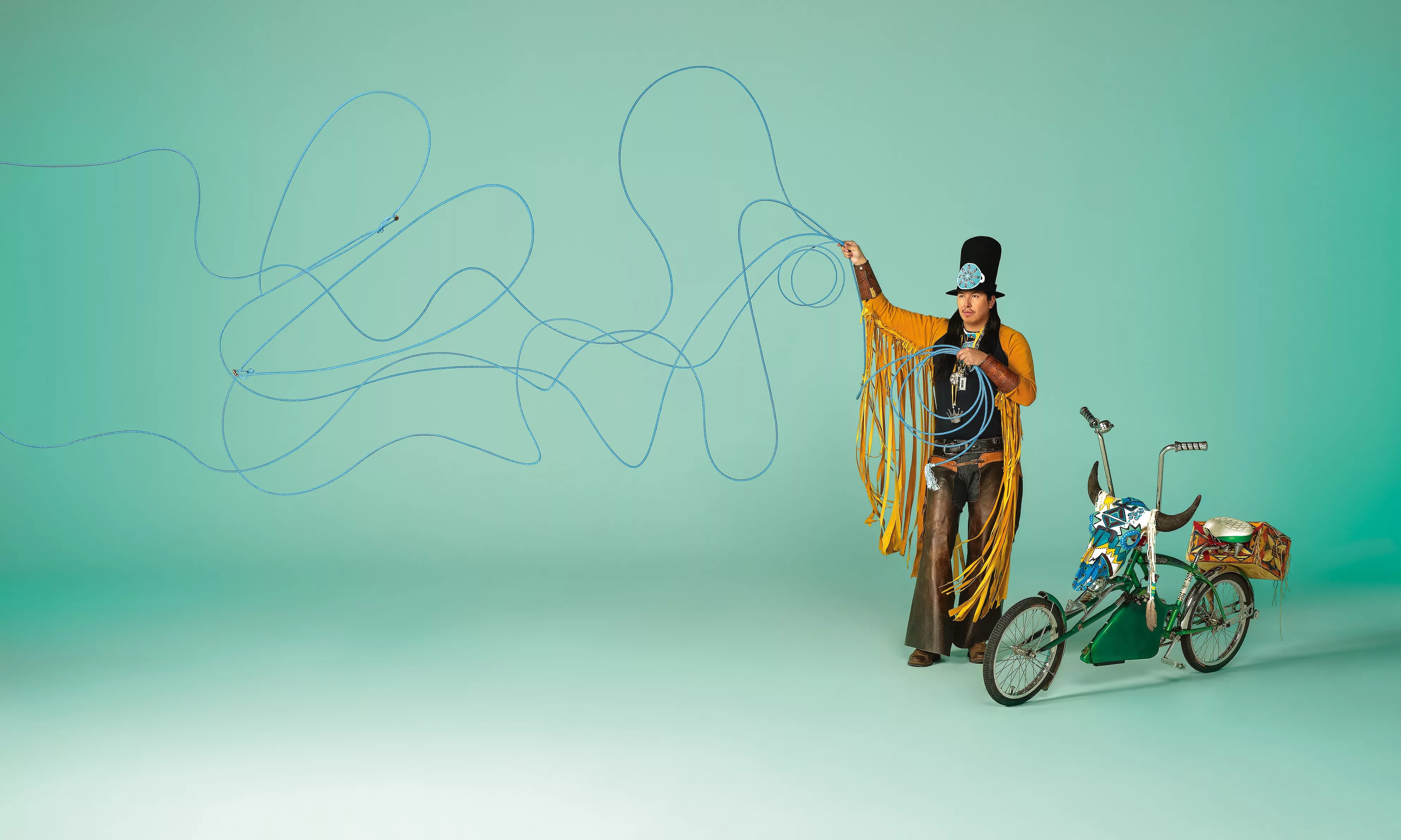 Without attempting to limit the work through characterization, Gibson does say that one through-line of his colleagues’ art is humor – often of a biting nature; in “Take a Picture with a Real Indian” (1991), James Luna offered to be photographed with museum visitors, either stripped to the waist and adorned with feathers and quills or in casual sportswear; designer Korina Emmerich produced an upcycled cotton shirt embroidered with the words “Discomfort is Progress” (2021); and the cover of New Red Order’s parody of the “New York Times Magazine” bears the headline “Tired of Living on Stolen Land? Give it Back” (“New Red Times Magazine” 2021).