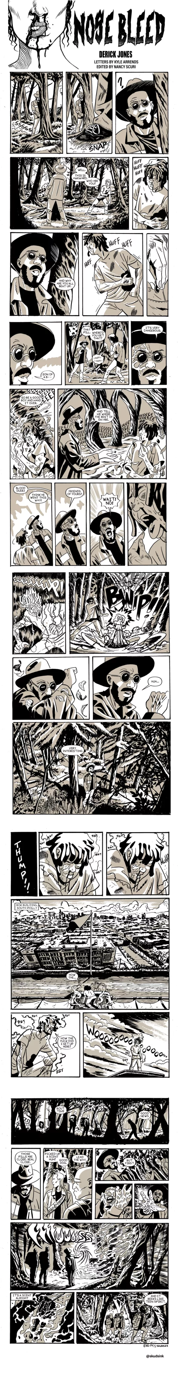 37 panel comic entitled “Nosebleed” Chapter 11 by Derick Jones. Letters by Kyle Arrends, Edited by Nancy Scuri. — Reggie, Esper