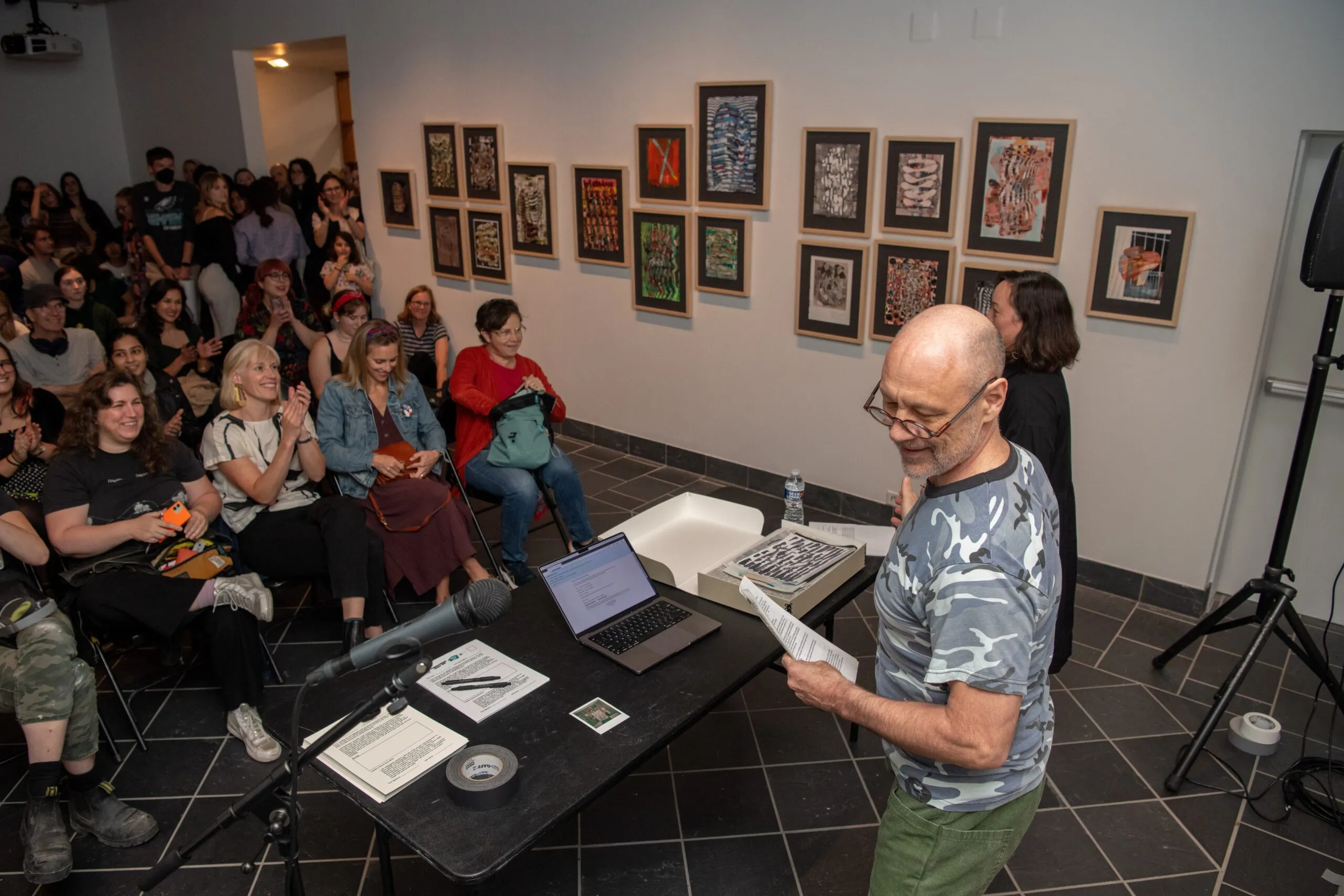 A man smiles and stands in the front of a crowded room with the audience smiling and some clapping, as he looks at a paper in his hands and points to a wall with art hanging on it. He is giving away his art and he is happy.