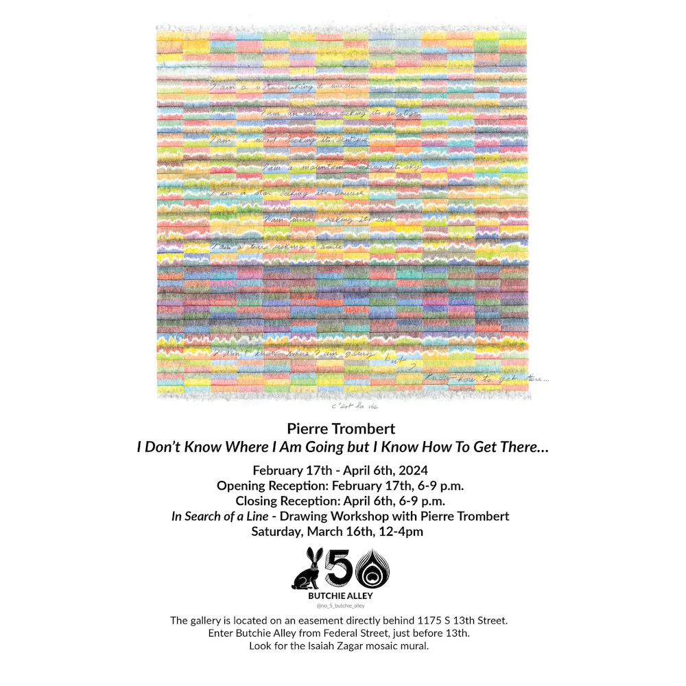 Pierre Trombert: I Don’t Know Where I Am Going, But I Know How To Get There, No. 5 Butchie Alley, until April 6th. Closing Reception with performance (TBA) April 6th, 6-9pm