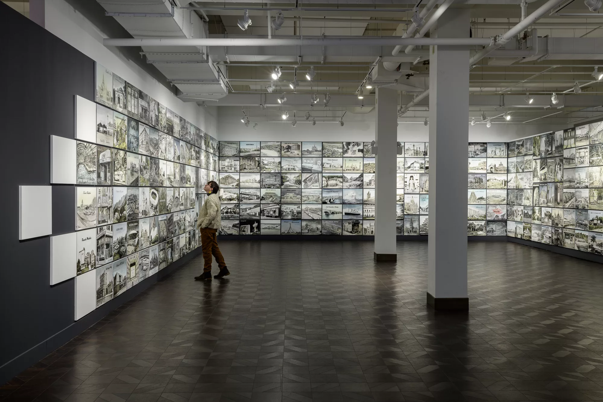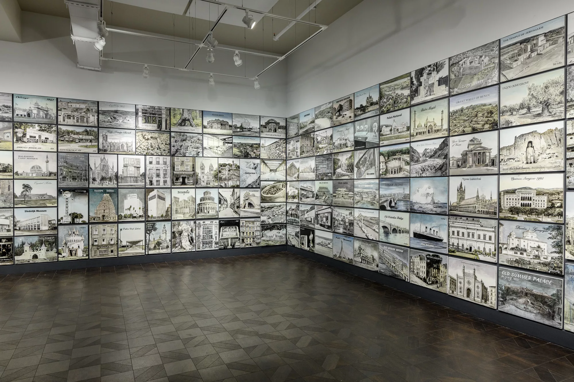 I have just seen Ellen Harvey’s The Disappointed Tourist, now at the Rowan University Art Gallery and Museum in Glassboro, NJ, and I can’t stop thinking about it. The exhibition–over 300 paintings– fills three walls of the gallery space, each wall comprising a grid of monochromatic acrylic paintings (black and white) on wood panels, 24 x 18 inches. It is an exhilarating show depicting things that have disappeared from the earth, a tribute to tragic loss and nostalgic memories that demonstrates the triumph of art over failure and defeat. Each of the paintings is based on a pre-existing image, typically a postcard or photograph, and all are based on ideas and images sent to the artist in response to the call: “Share with us a place you want to visit that no longer exists.” The project has been touring the world since 2019, when it started in pre-Covid Milwaukee, with subsequent stops in Austria, Poland, England and Ireland, and now in New Jersey. With every stop, Harvey adds new paintings in response to local suggestions, so that with each iteration the global network of memory expands.