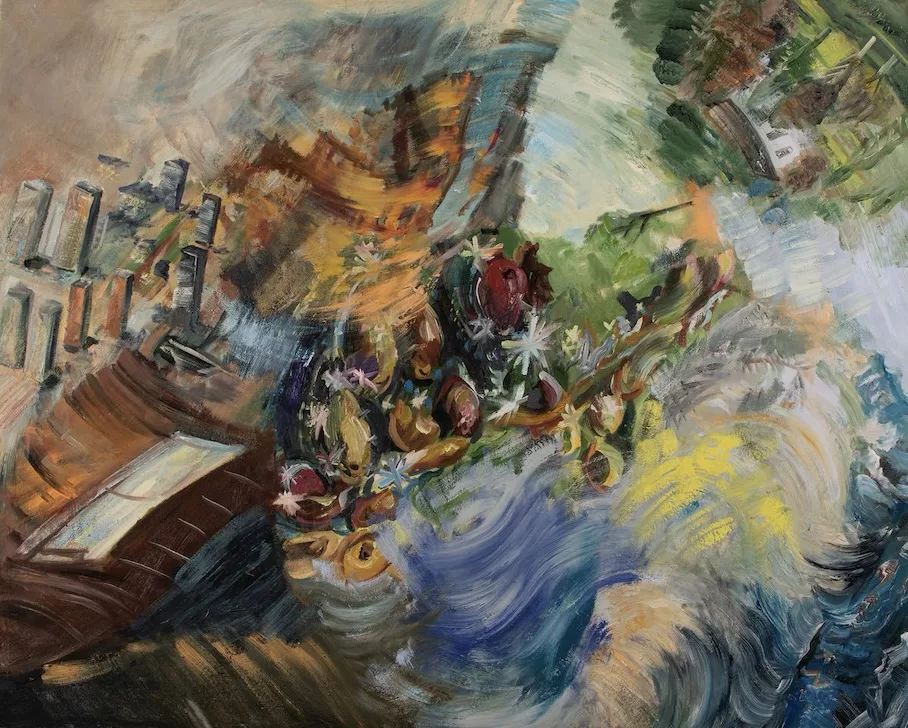 The pursuit of freedom seems to underlie and animate so much of Elizabeth’s art. This understanding crystalized during our conversation when Elizabeth talked about how she prefers landscape to figuration. “My paintings are mental constructions expressing escape from people and their voices. I prefer landscape to portraiture or interiors. I have a deep need to see open vistas, sky, and fields. Every painting in this show includes open areas of abstraction that offer respite from movement and change. Juxtaposing abstraction with recognizable objects signals that you are looking at an imaginary, internal space. To me the paintings feel busy but quiet, but viewers might feel differently.”